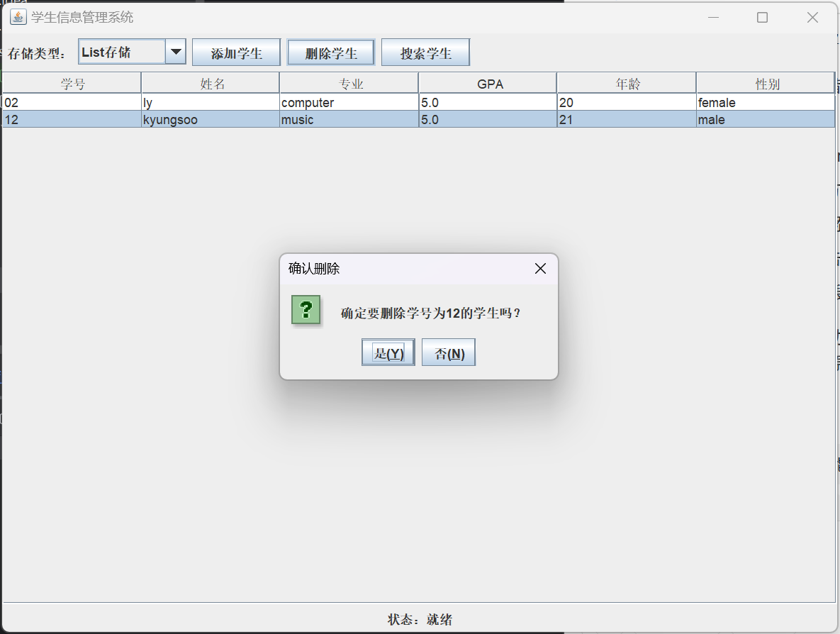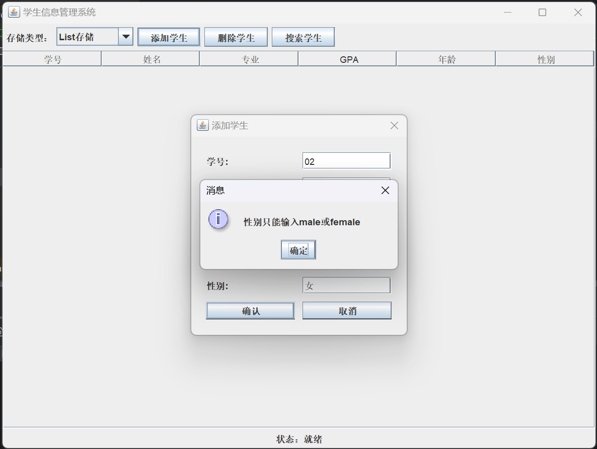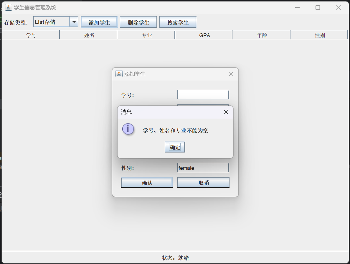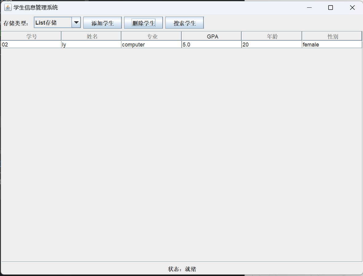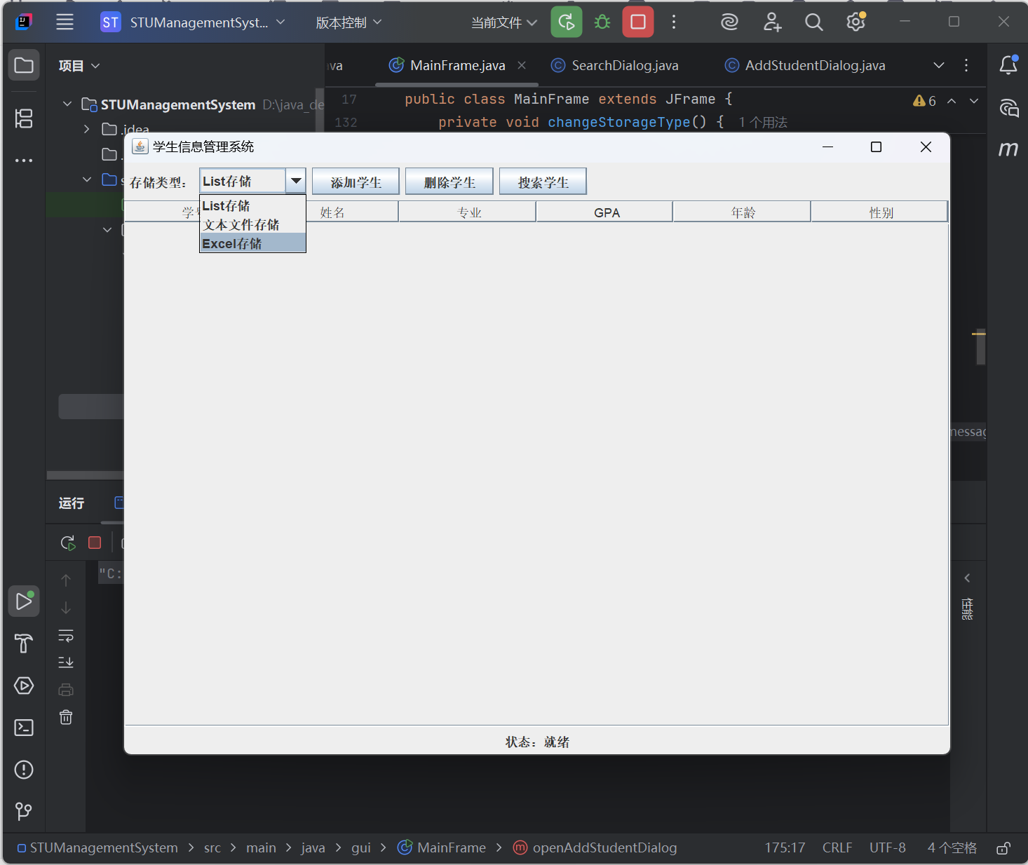 本文介绍了一个基于Java Swing的学生管理系统GUI实现。系统采用MVC架构模式,将业务逻辑封装在StudentService中,提供三种数据存储方式(List、文本文件、Excel)。主要功能包括: 主界面使用JTable展示学生数据,支持三种存储方式的切换 提供添加学生信息的弹窗对话框 支持删除选中学生记录 实现按姓名/专业/GPA搜索功能 系统实现了业务逻辑与界面的分离,同一套业务代码