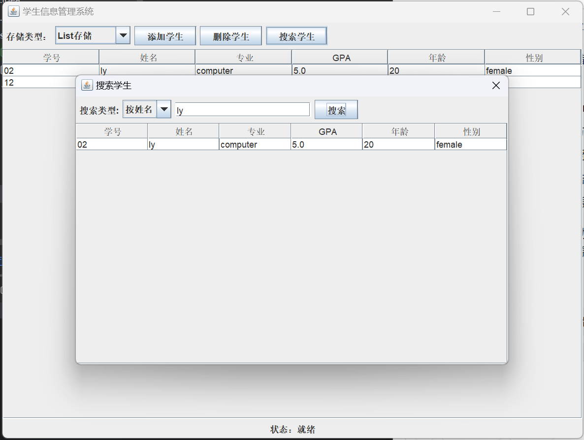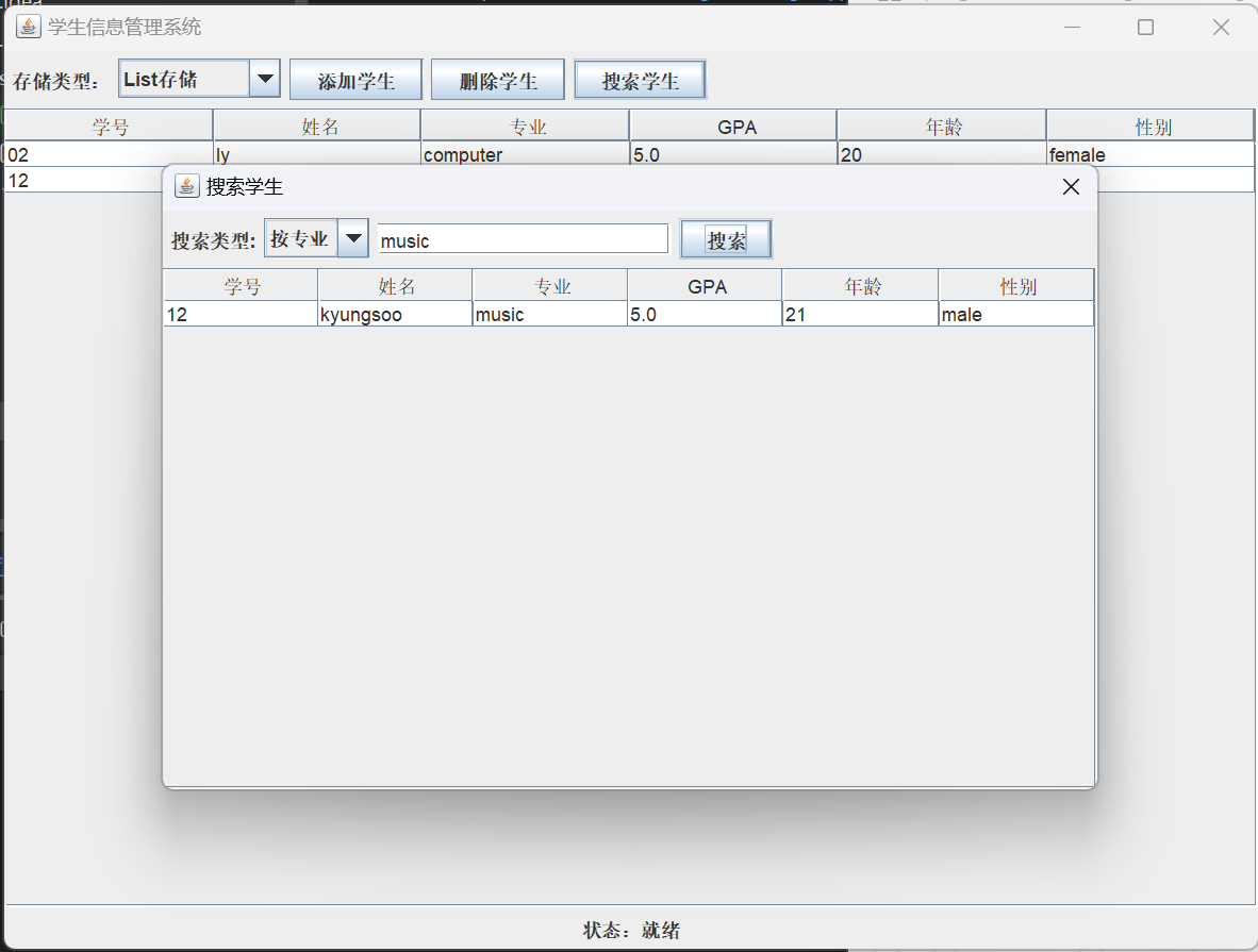 4、点击 "搜索学生" 按钮打开搜索对话框,可按姓名、专业或 GPA 搜索。