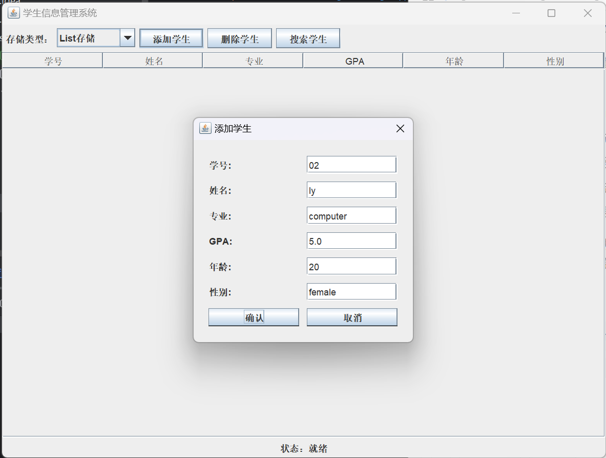 2、点击 "添加学生" 按钮打开添加对话框,依次输入学生信息。