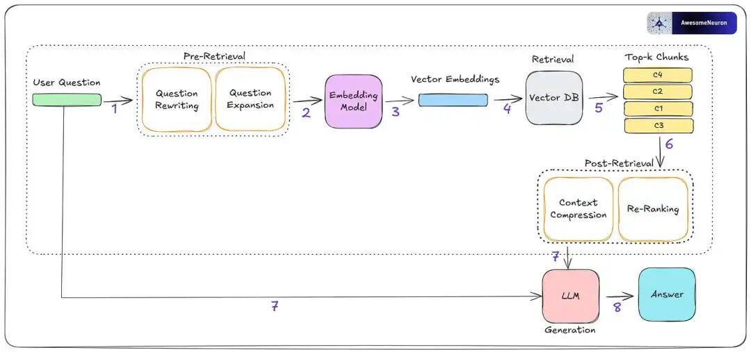高级RAG在朴素RAG的基础上进行了优化,旨在解决其在信息检索方面的局限性。它通过一系列预检索策略、后检索策略以及微调嵌入模型,显著提升了传递给LLM的上下文质量。
