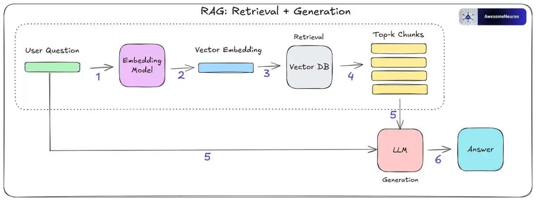 - 答案生成:LLM将用户的问题以及这些检索到的信息块作为上下文输入。