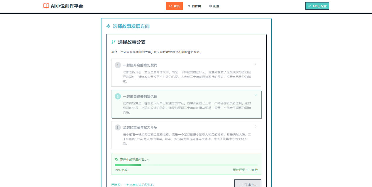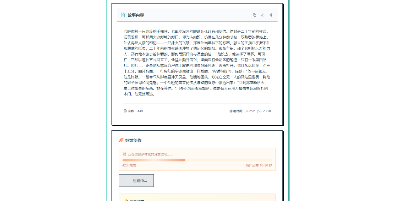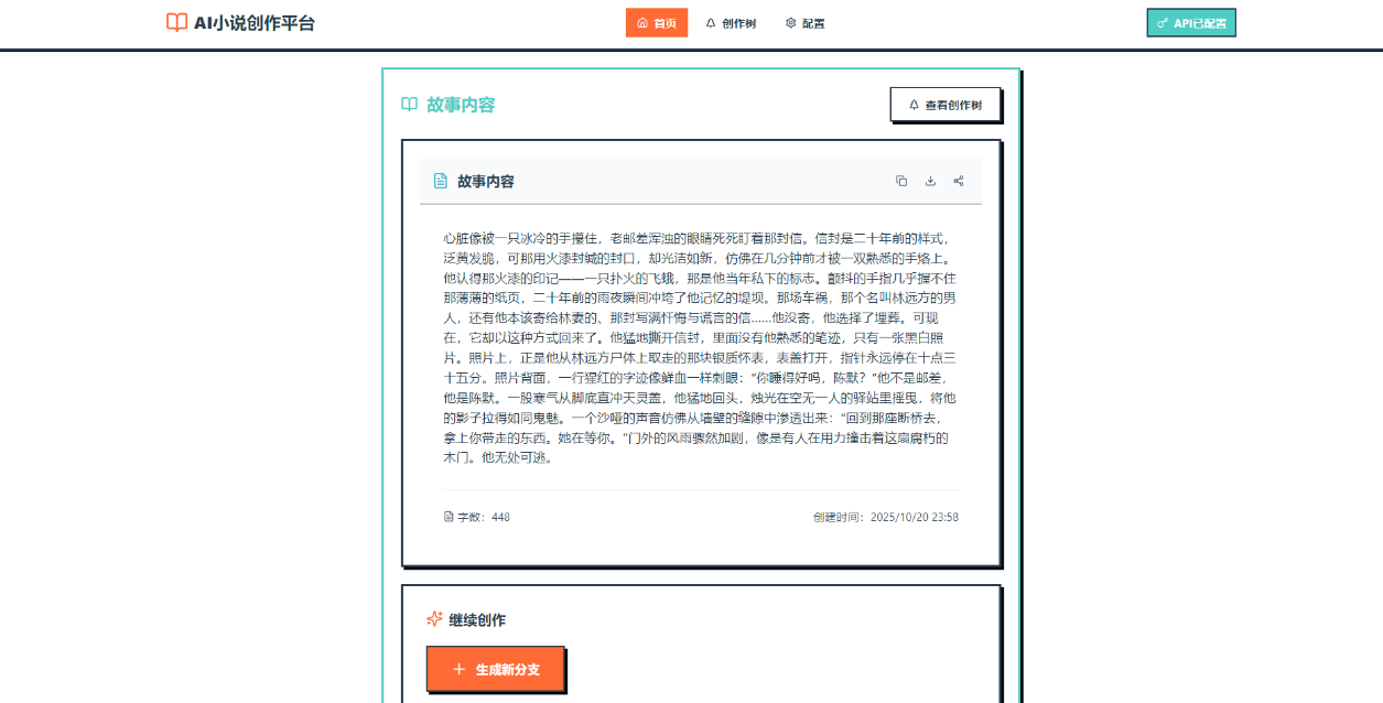 | 首页 | 详细情节生成 | 基于用户选择的分支调用GLM-4.6生成300-500字的详细情节内容 |