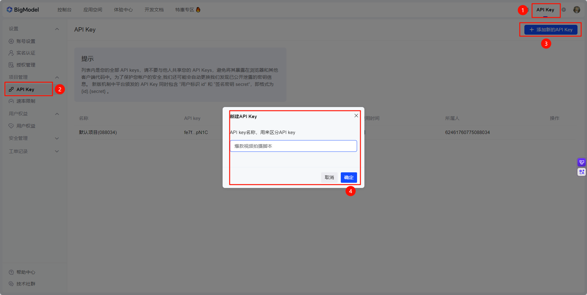 在智谱AI开放平台的控制台中,即可添加账号的API KEY