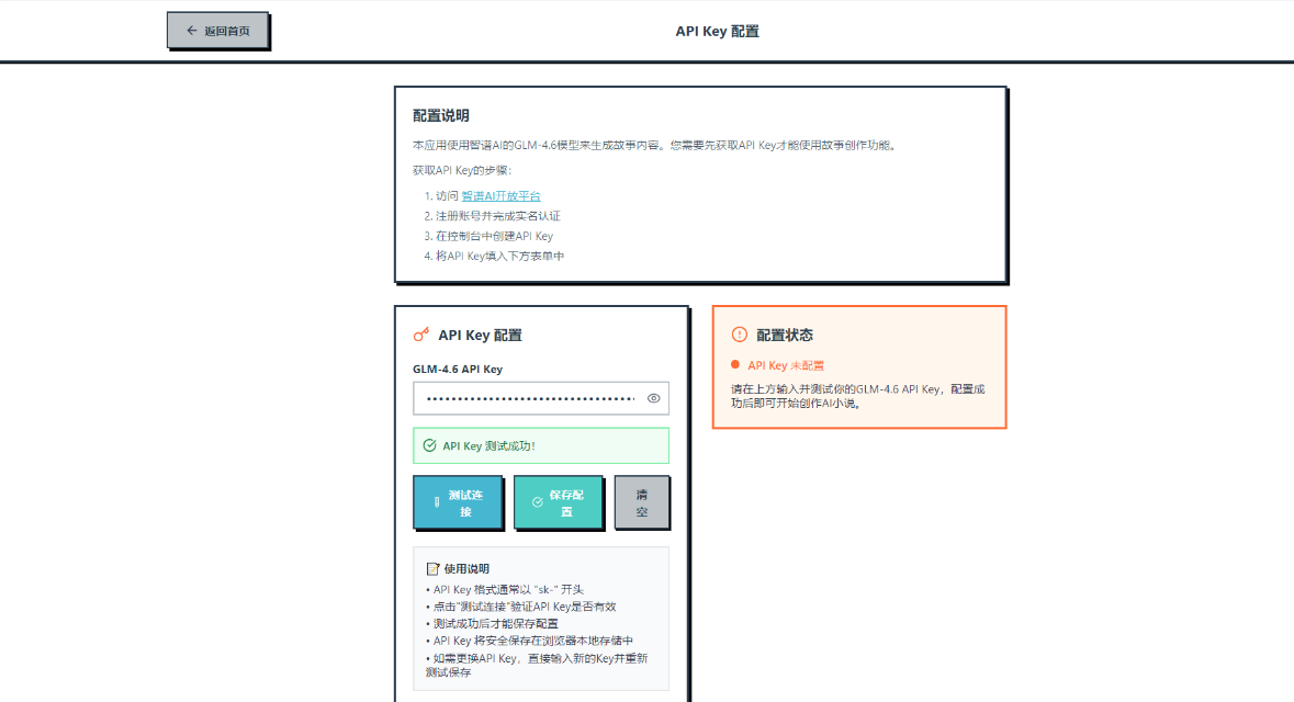 在“AI小说创作平台”这一应用中,我们正是依托 Trae Solo 的高效调度能力,结合 GLM-4.6 在叙事生成、情节延展与风格控制上的强大语言建模优势,实现了从用户输入的故事开头到多分支剧情概览、再到沉浸式章节内容的端到端智能创作。通过本地化 API 管理与无登录轻量架构,智谱大模型不仅为写作者提供了低门槛、高自由度的创作杠杆,更重新定义了 AI 驱动下互动式小说生成的新范式。