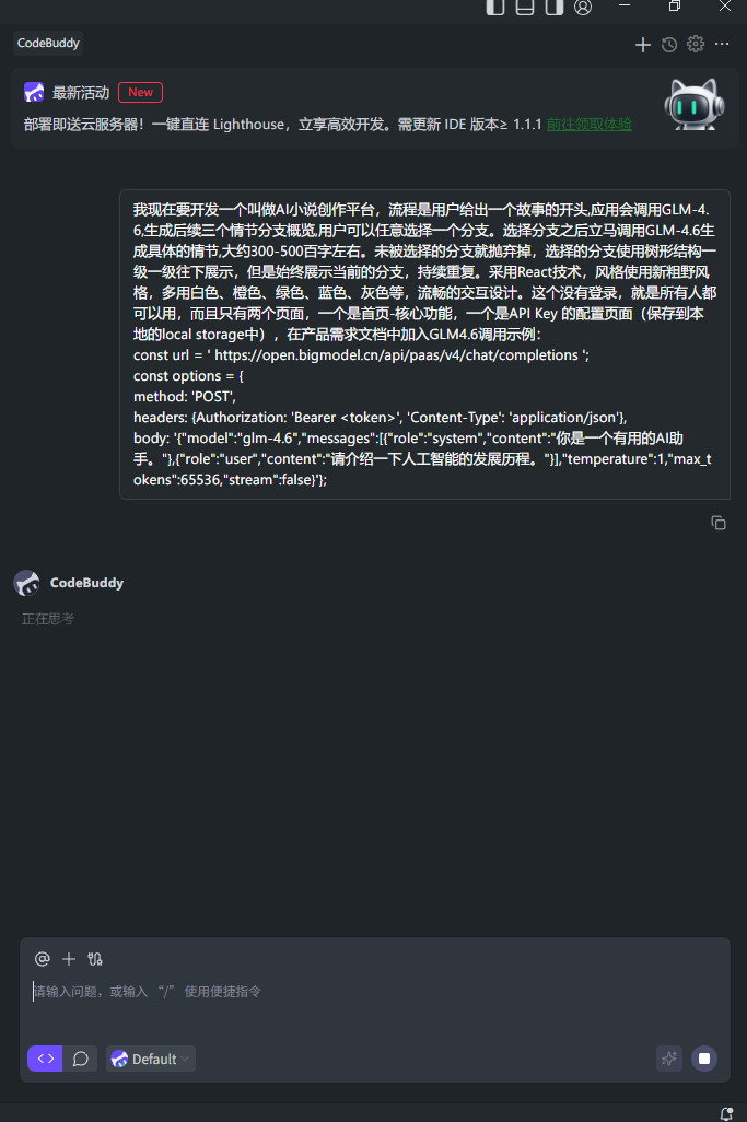 本项目深度融合 CodeBuddy 的高效前端开发与任务调度能力,以及 GLM-4.6 在中文叙事、情节构建和风格一致性上的卓越表现,构建出“用户选剧情,AI写故事”的沉浸式创作闭环。用户只需输入一个故事开头,系统即刻生成三个风格各异的情节分支概览;选定其一后,AI将续写 300–500 字的高质量正文,并在此基础上持续衍生新分支,形成一棵动态生长的故事树。整个过程无需注册,API Key 通过本地存储安全保存,兼顾隐私与便捷。