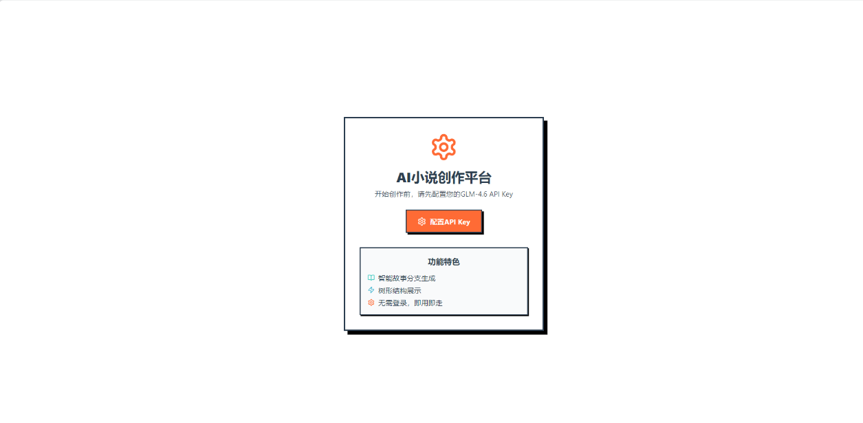 我现在要开发一个叫做AI小说创作平台,流程是用户给出一个故事的开头,应用会调用GLM-4.6,生成后续三个情节分支概览,用户可以任意选择一个分支。选择分支之后立马调用GLM-4.6生成具体的情节,大约300-500百字左右。未被选择的分支就抛弃掉,选择的分支使用树形结构一级一级往下展示,但是始终展示当前的分支,持续重复。采用React技术,风格使用新粗野风格,多用白色、橙色、绿色、蓝色、灰色等,流畅的交互设计。这个没有登录,就是所有人都可以用,而且只有两个页面,一个是首页-核心功能,一个是API Key 的配置页面(保存到本地的local storage中),在产品需求文档中加入GLM4.6调用示例: