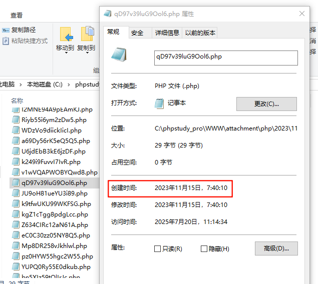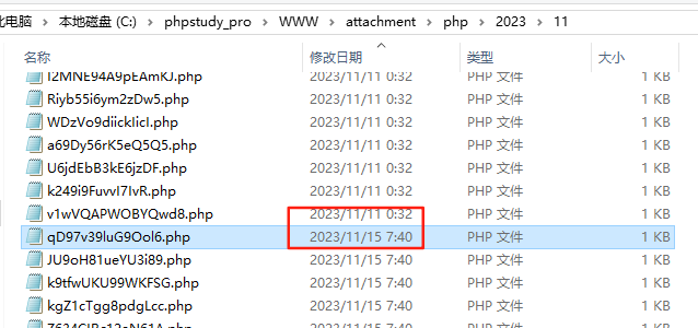 发现大量WebShell文件,点进去C:\phpstudy_pro\WWW\attachment\php\2023\11,按时间排序,找到最早的WebShell落地时间即可