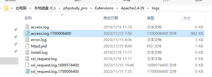 这里我们主要审计Apache的日志,打开C:\phpstudy_pro\Extensions\Apache2.4.39\logs,审计access.log.1700006400