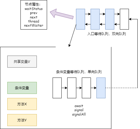 虽然二者共用了 Node 类,但是条件等待队列是单向队列,入口等待队列是双向队列,条件队列中下一个节点的引用是 nextWaiter,入口等待队列中下一个节点的引用是 next。