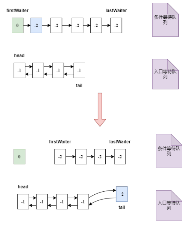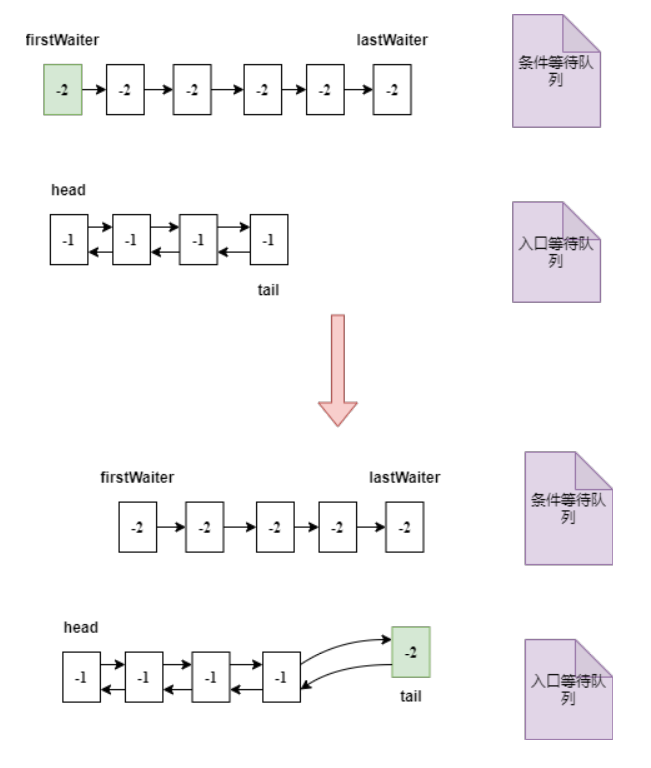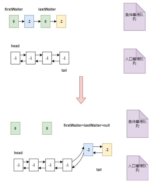 将条件等待队列中的所有节点依次加入入口等待队列。如下图: