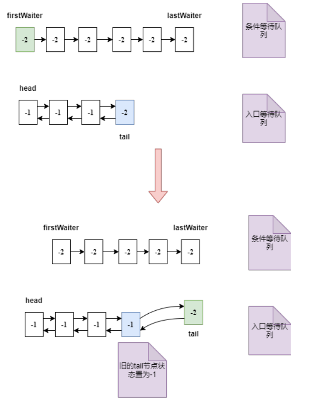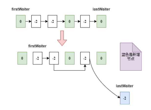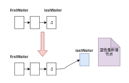 如果入口等待队列中 tail 节点的 waitStatus 小于等于 0,则 firstWaiter 加入后需要把旧 tail 节点置为 -1 (表示后面节点等待当前节点唤醒),如下图: