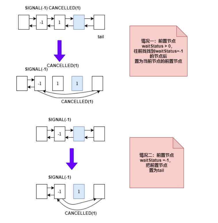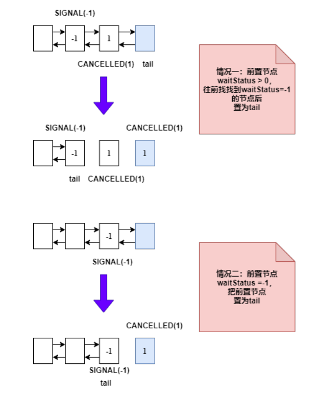 如果获取锁抛出异常,则取消获取锁,如果当前节点是 tail 节点,分两种情况如下图: