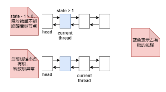 独占锁释放分两步:释放锁,唤醒后继节点。