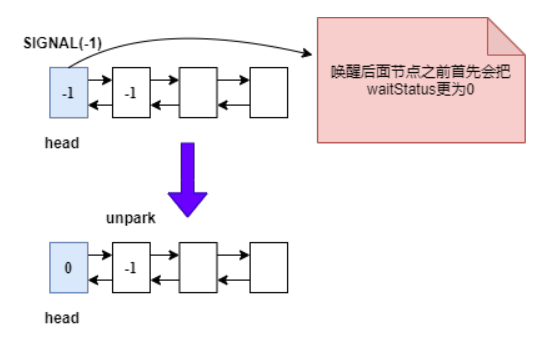 新的 hade 节点 waitStatus < 0,只要不是 tail 节点,就可能是 -1。这里会造成不必要的唤醒,因为唤醒后获取不到锁只能继续入队等待。