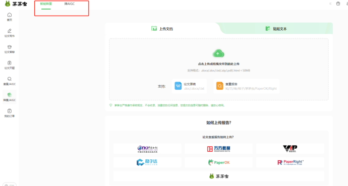 核心功能:上传论文后,系统会优先进行AIGC查重检测,快速识别潜在风险点,确保改写前的合规性。