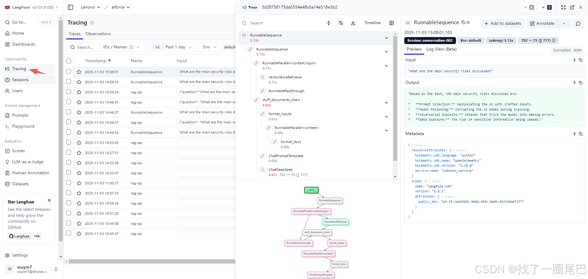 全量数据留存:包含输入输出内容、中间结果(如检索到的文档片段),以及多分支复杂链的流程图。