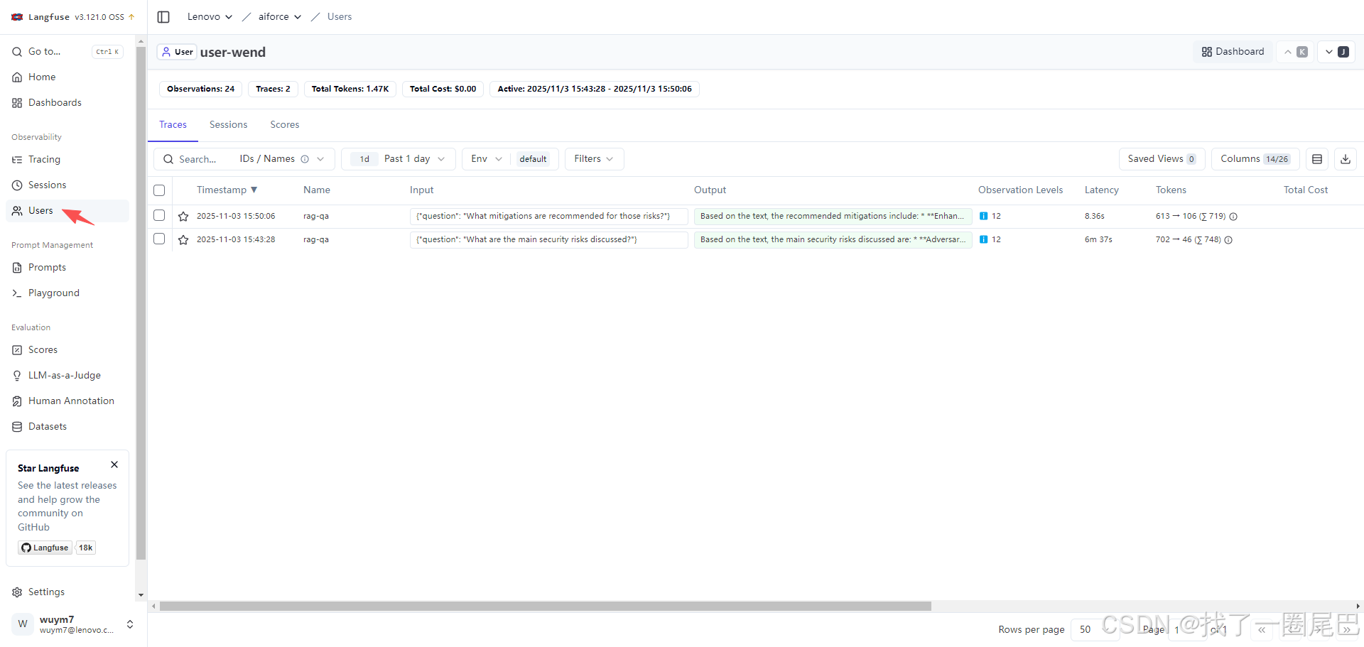 核心目的:真实 LLM 应用需要明确 “哪个用户发起了哪些请求”,用户追踪正是为了建立 “用户 ID - 相关请求 - 会话 - 追踪(Traces)” 的关联链路,让观测数据能按用户维度聚合。