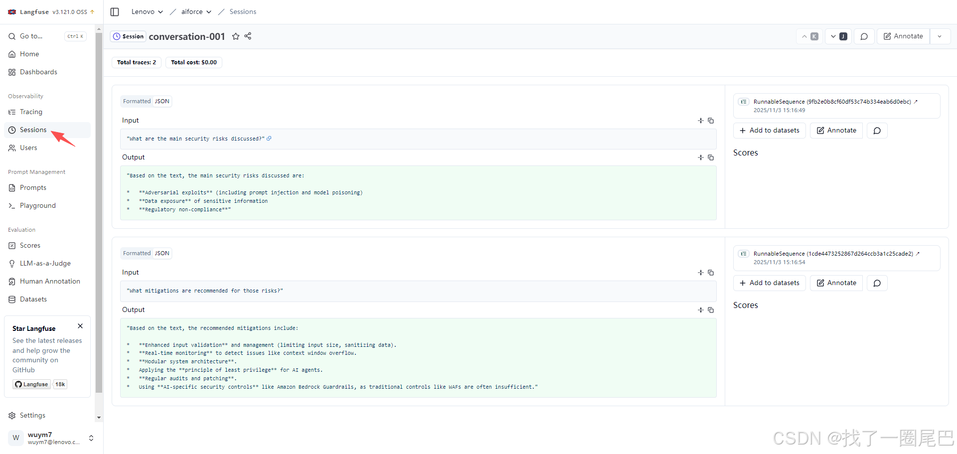 核心作用:将同一用户的关联对话(如 3 个相关的安全风险问题)对应的多个 Traces 分组,形成完整对话线程。