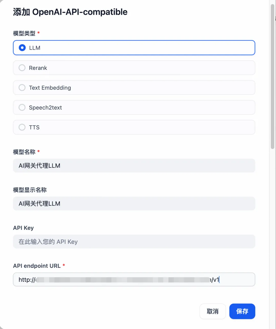 - 在 Dify 控制台,在右上角点击设置 - 模型供应商,为 OpenAI-API-compatible 添加模型,以 LLM 模型为例,其中模型类型、模型名称和 API Endpoint URL 为必填,API Endpoint URL 为步骤 1 在 AI 网关创建的 LLM API 的域名 + 前缀,其他参数可按需配置,点击保存。