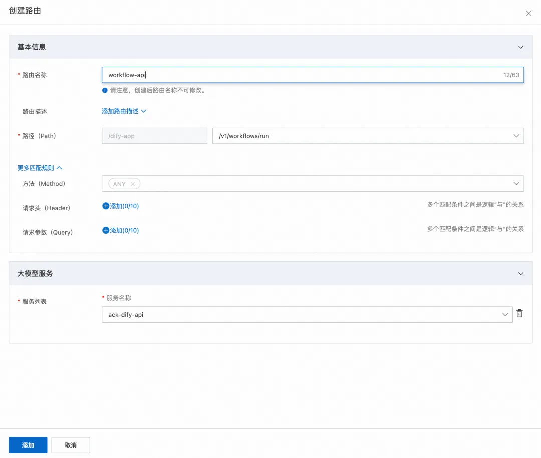 如果您希望一条路由对应一个 Dify 应用,可以在更多匹配规则中,设置请求头和请求参数匹配,如设置 header-key=app-id,需要注意您在通过 AI 网关访问 Dify 应用时,需自主携带对应的匹配内容。