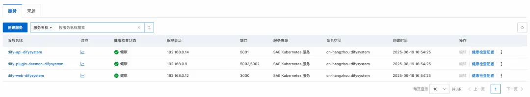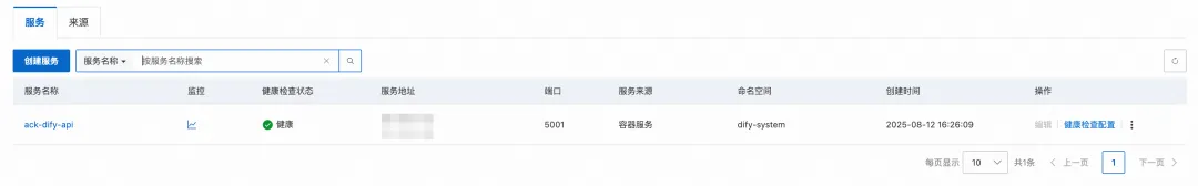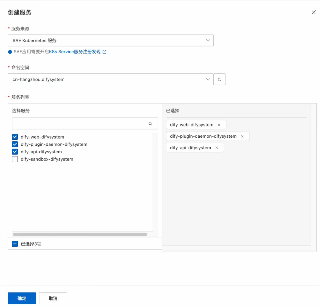 在服务 - 服务 - 创建服务处添加部署 Dify 的 SAE 命名空间下的 dify-api-{namespace} 应用。