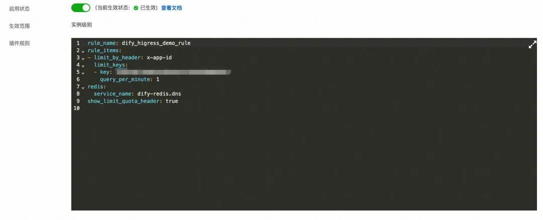 在 AI 网关中完成 Redis 应用创建之后,在插件市场中使用基于 Key 集群限流插件,通过配置插件规则,即可实现针对不同 Dify 应用的限流策略。基于集群限流插件的详细使用方式见基于 Key 集群限流【2】。