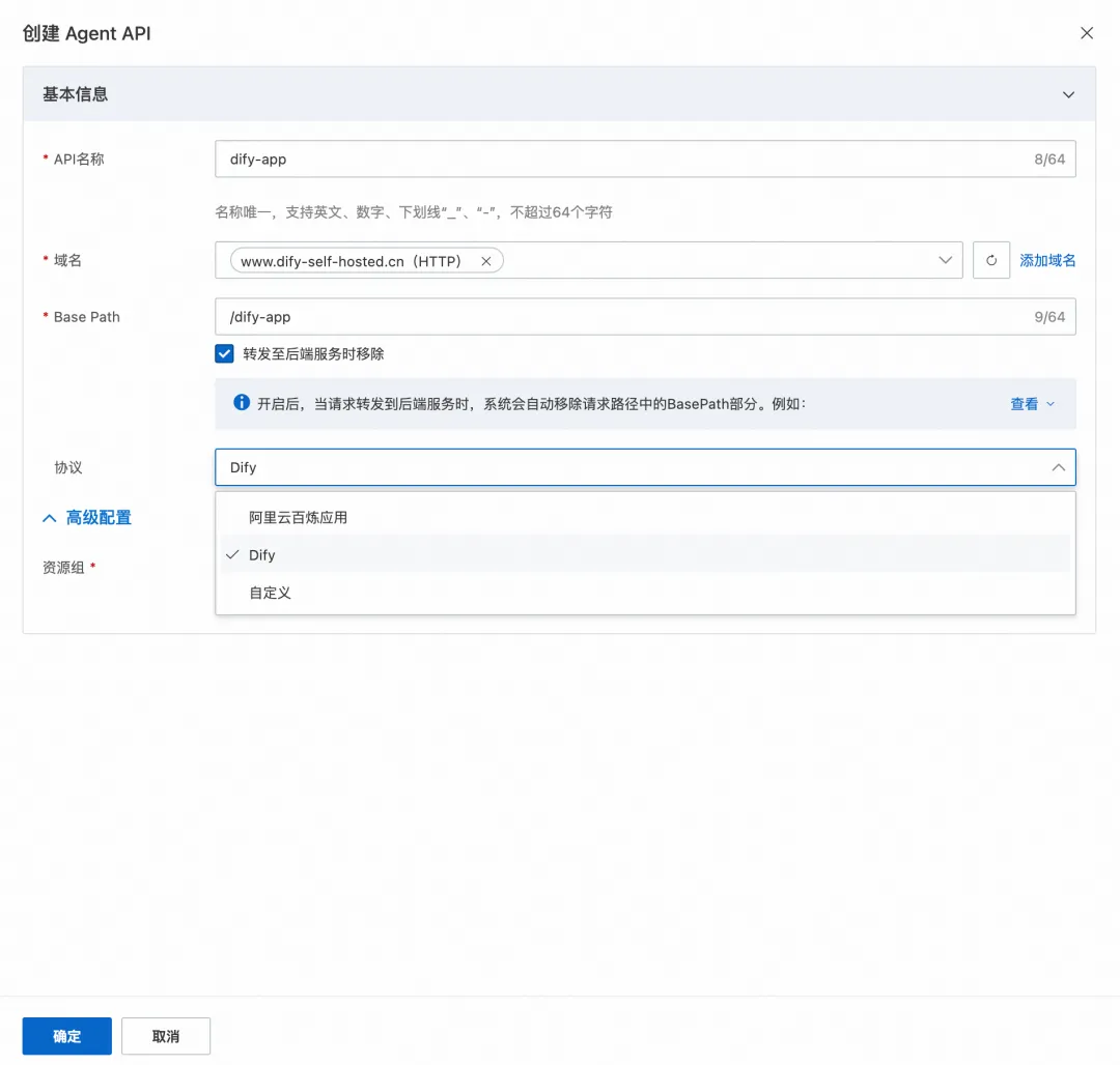- 创建 Agent API。点击 Agent API 创建 Agent API,其中域名和 Base Path 可以根据实际情况配置,用于通过域名访问 Dify 并且避免和其他服务的路径冲突,勾选转发至后端服务时移除,协议选择 Dify。