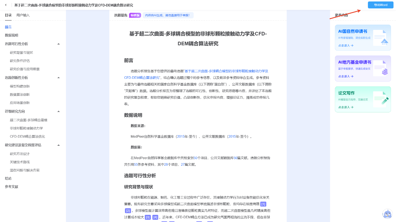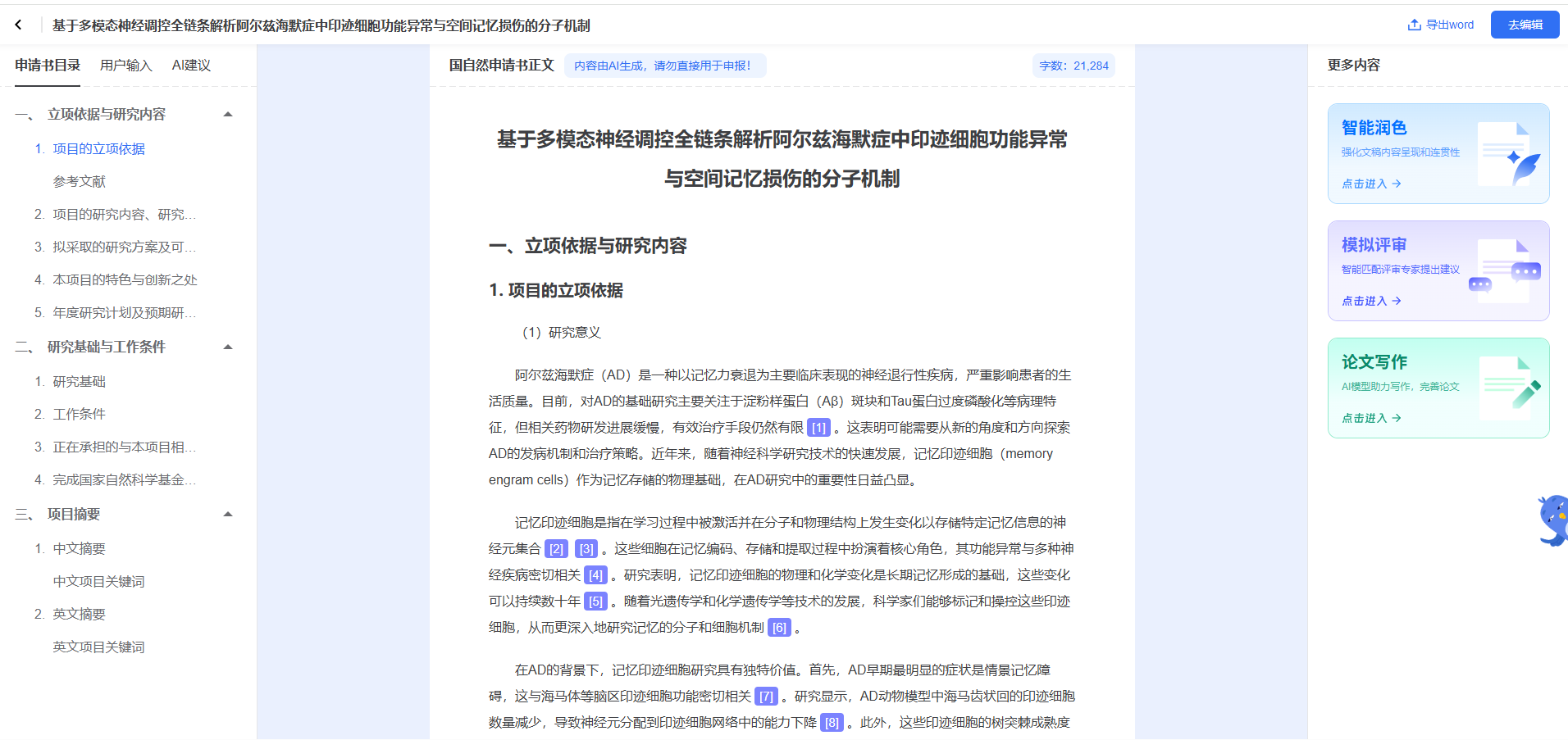 - AI国自然申请书 提供从研究思路优化、专家虚拟讨论到完整申报书生成的全流程服务,确保结构合理、逻辑清晰、格式符合官方指南。