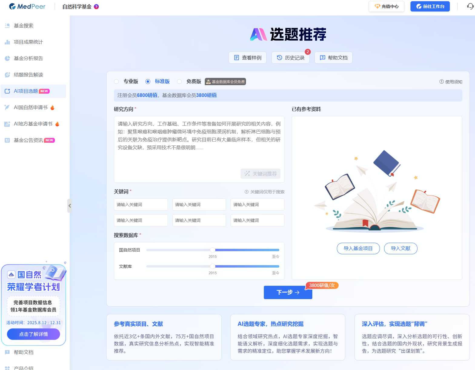 借助 MedPeer 这样的智能科研平台,不仅可以缩短信息差距,还能在选题、立项依据、文本质量等环节达到更高标准,让“普通科研人”具备与资深专家同台竞争的条件。卷不可避免,但在同样的赛道上,谁的准备更充分,谁就更有机会。