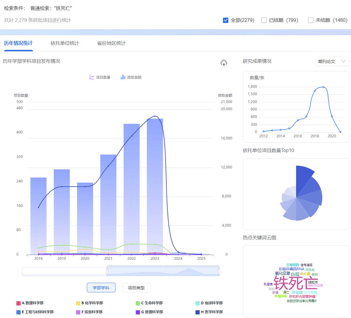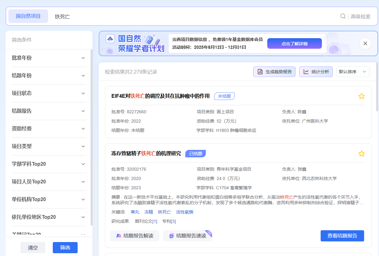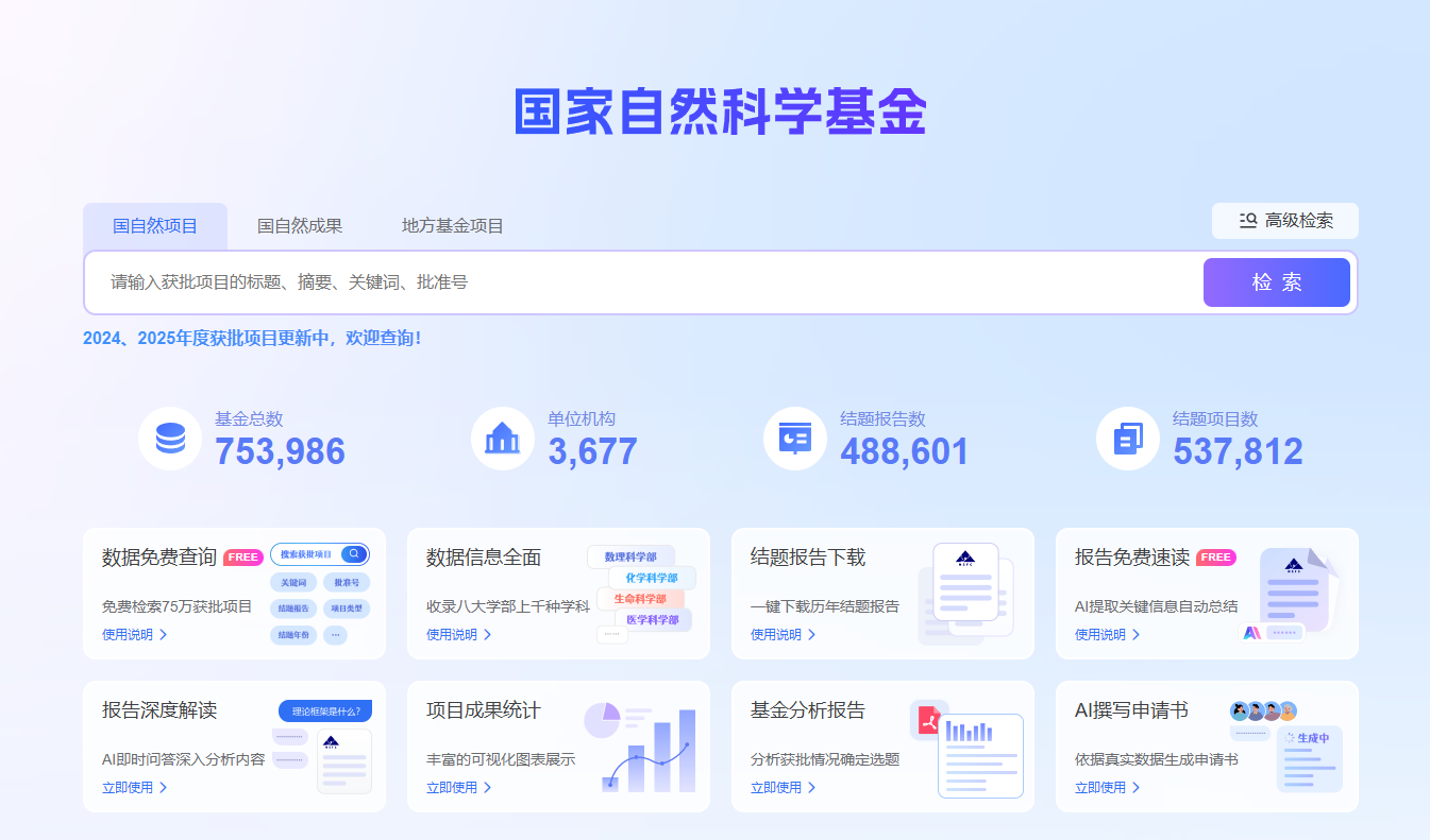 - 基金数据库 收录了自1986年以来的75万+国自然获批项目与635万+成果,结合可视化趋势分析,科研人员可以快速识别当前热点方向、资助率较高的领域以及竞争强度。