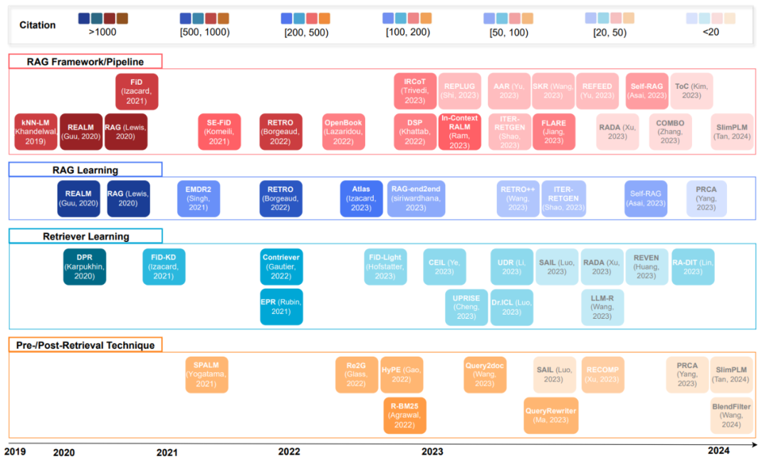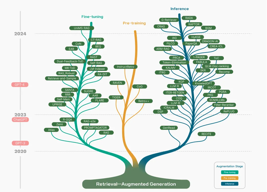 “RAG研究技术树”涵盖预训练、微调和推理三个阶段。随着大语言模型(LLMs)的兴起,RAG研究早期聚焦于利用LLMs的上下文学习能力,主要集中在推理阶段。后续研究逐步深化,将RAG与LLMs的微调紧密结合。同时,研究者也在探索通过检索增强技术优化预训练阶段的语言模型。