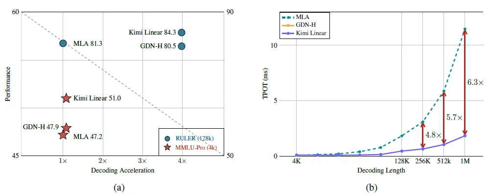 长文本理解才是真正考验一个模型的战场。研究团队测试了从4000词到一百万词的各种长度文本。在128000词的RULER测试中,Kimi Linear获得了84.3分的惊人成绩,而全注意力基线只有81.3分。更重要的是速度优势,在处理一百万词的文本时,Kimi Linear的解码速度是全注意力方法的6.3倍,每生成一个新词只需要1.84毫秒,而全注意力方法需要11.48毫秒。同时,由于只保存了四分之一的缓存数据,Kimi Linear可以用同样的内存处理更长的文本,或者同时处理更多的请求。