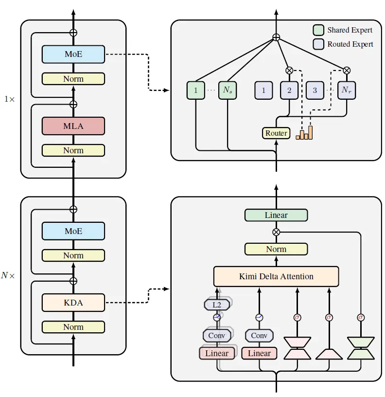 A:关键在于它的细粒度门控机制和混合架构设计。KDA通过智能的"记忆管理",让模型既能快速处理信息又不损失重要细节。同时,通过在关键位置插入全注意力层,保证了模型在需要全局视野时的准确性。这就像是配备了既快又准的索引系统的图书管理员,在效率和准确性之间找到了完美平衡。