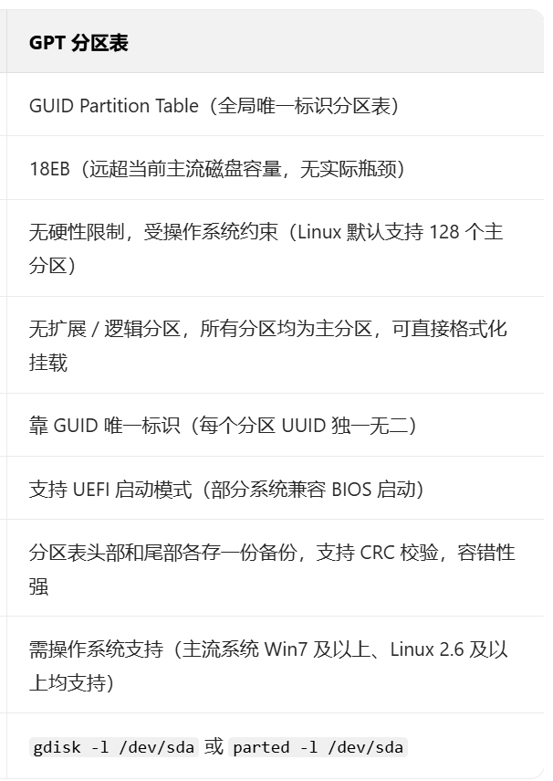 - 所有分区均为主分区:GPT 中没有 “扩展分区”“逻辑分区” 的概念,所有创建的分区都是主分区,可直接格式化并挂载使用