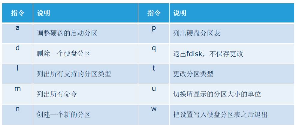 使用命令“fdisk 设备名”,就可以进入fdisk程序的交互模式,在交换模式中可以通过输入fdisk程序所提供的指令如表6-2所示,通过相应指令完成相应的操作。