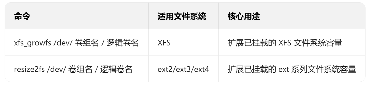 这是针对XFS 类型文件系统的工具,作用是扩展已挂载的 XFS 文件系统容量—— 当通过 LVM 扩展了逻辑卷(LV)的空间后,需用该命令让 XFS 文件系统识别并使用新增的磁盘空间。