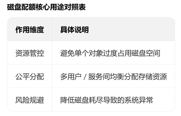 - 避免单个用户、应用或目录过度占用磁盘,导致其他用户 / 服务因空间不足无法运行;
