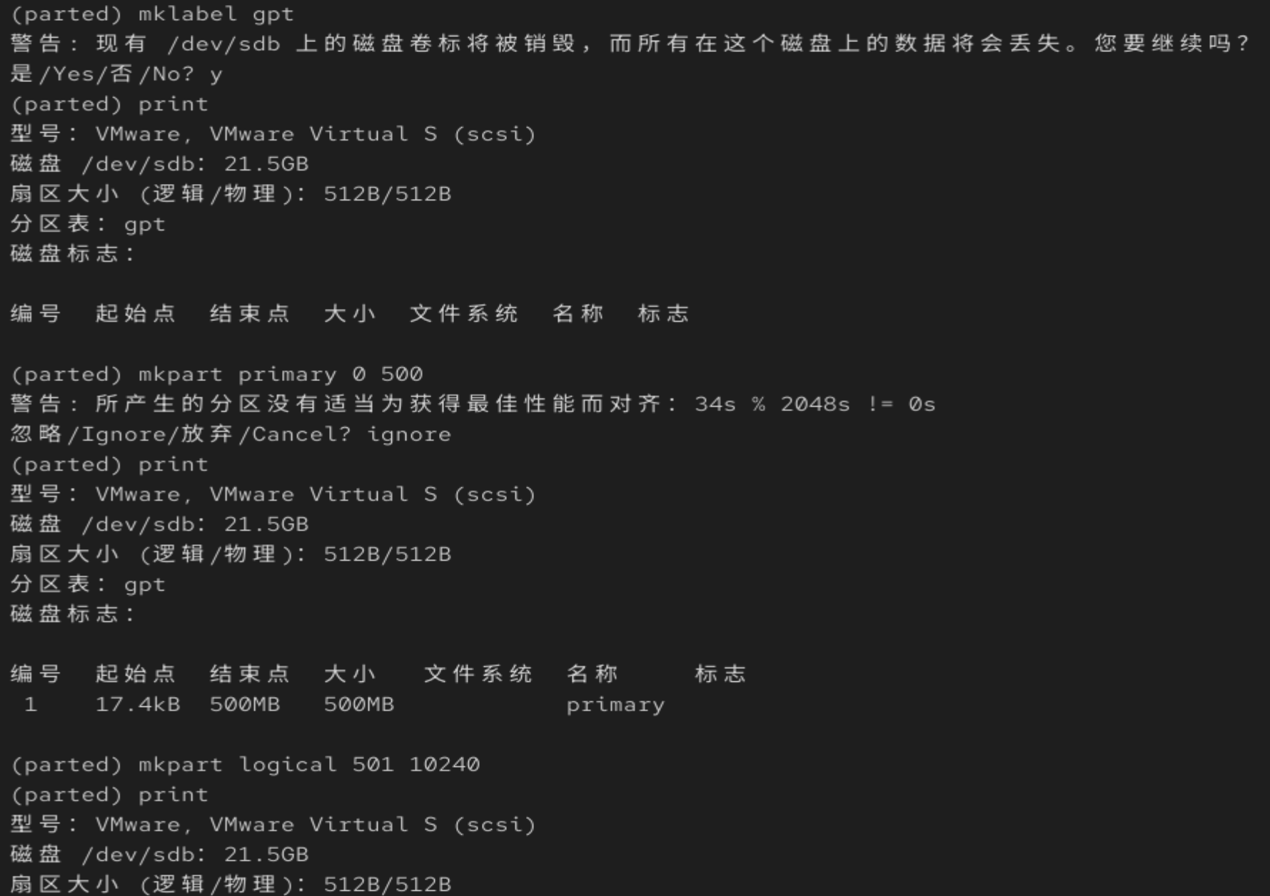 - mkpart 分区类型 [文件系统类型] 起始点 终止点 #创建一个分区