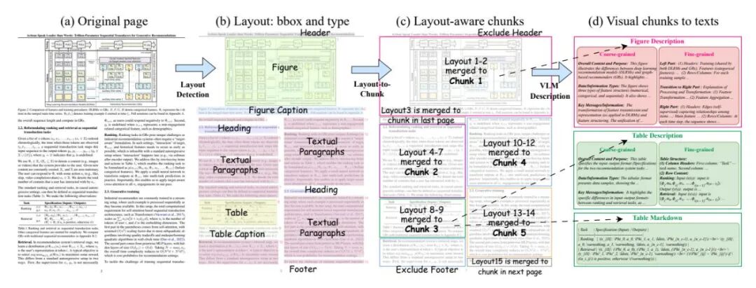 Doc-Researcher的深度解析技术像专业的文档翻译官,能够完整保留文档的原始结构。具体实现分为三步:首先通过布局分析工具扫描文档,识别文本、表格、图表和公式等元素及其位置关系;接着将视觉元素智能转换,表格和图表生成粗细两种粒度的文字描述,公式转为LaTeX格式;最后按语义边界将相关元素合并为信息块,形成从摘要到全文的四种粒度表示。