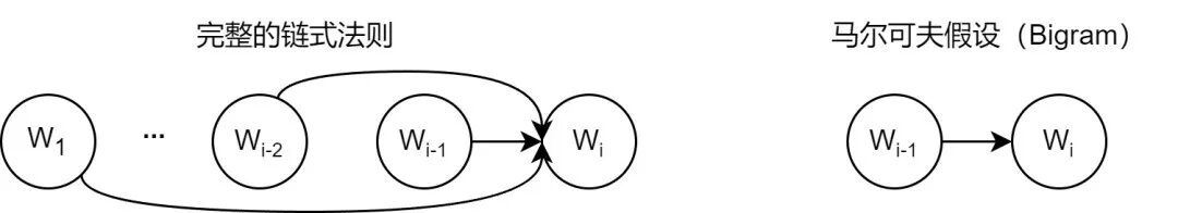 Bigram (当 N=2 时) :这是最简单的情况,我们假设一个词的出现只与它前面的一个词有关。因此,链式法则中复杂的条件概率 就可以被近似为更容易计算的形式: