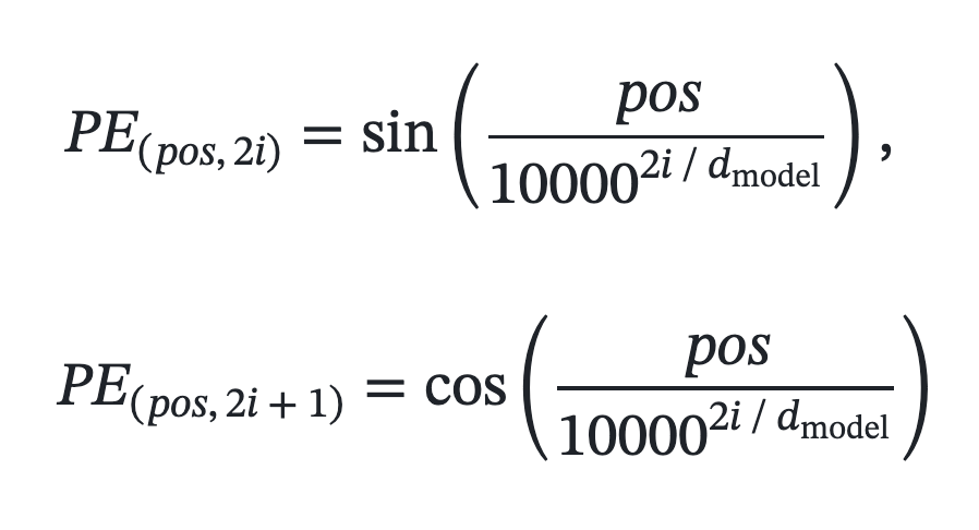 位置编码的核心思想是,为输入序列中的每一个词元嵌入向量,都额外加上一个能代表其绝对位置和相对位置信息的“位置向量”。这个位置向量不是通过学习得到的,而是通过一个固定的数学公式直接计算得出。这样一来,即使两个词元(例如,两个都叫 agent的词元)自身的嵌入是相同的,但由于它们在句子中的位置不同,它们最终输入到 Transformer 模型中的向量就会因为加上了不同的位置编码而变得独一无二。原论文中提出的位置编码使用正弦和余弦函数来生成,其公式如下: