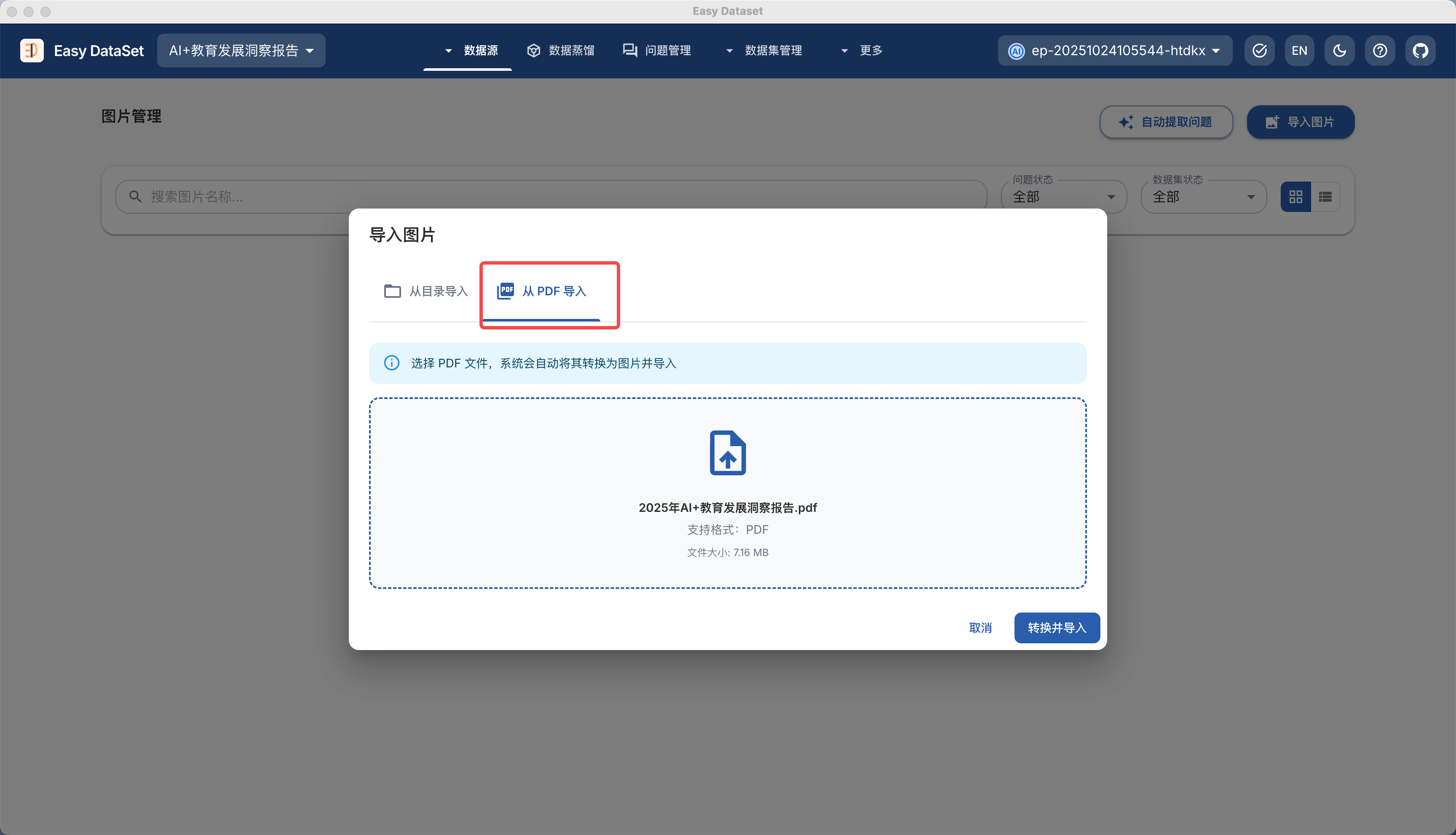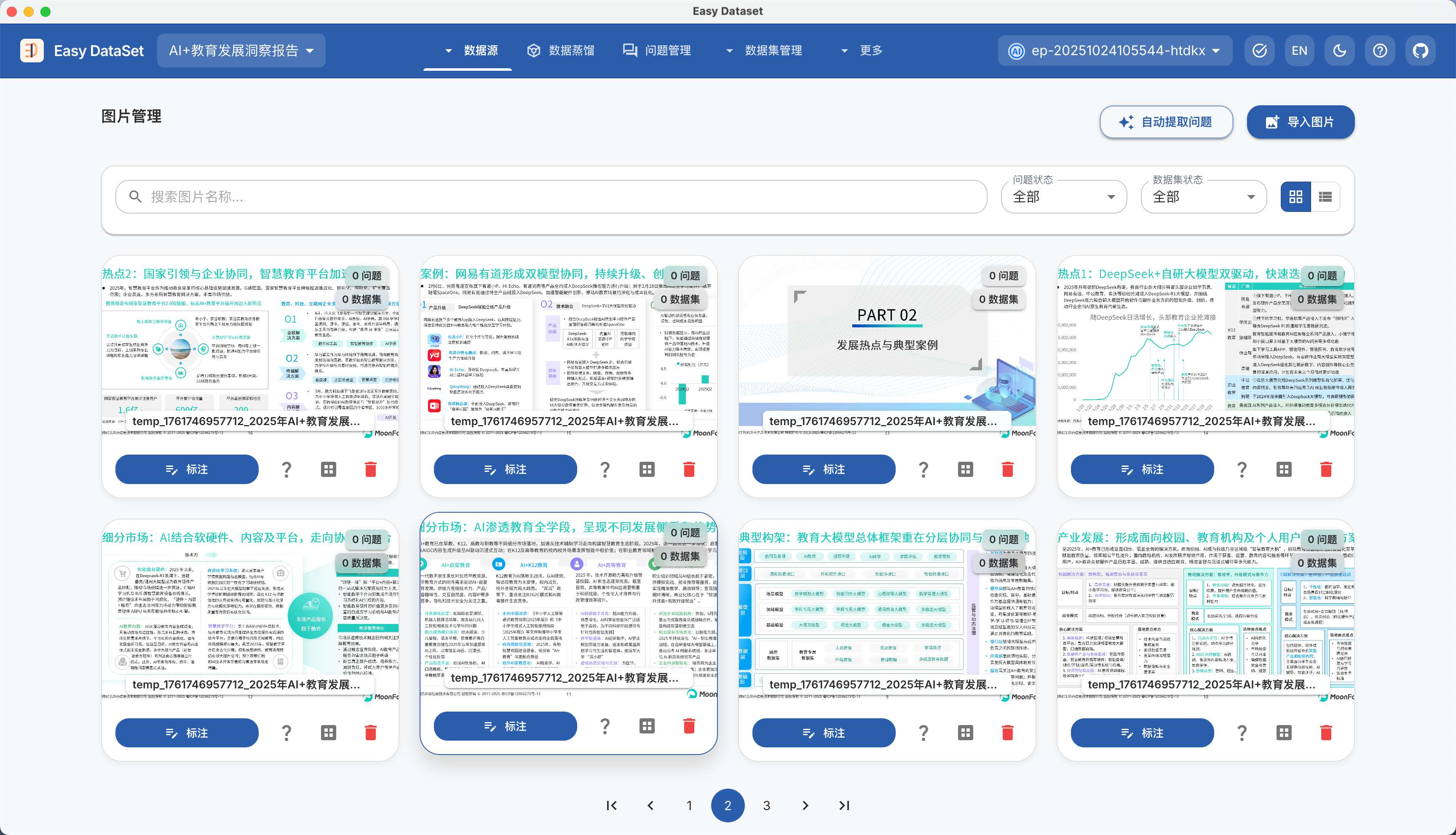 首先是菜单的改版,原本的文献处理模块被收缩到了新的 “数据源” 模块,并且在此功能上新增了一个 “图片管理” 模块。这代表着 EDS 当前不仅可以支持文本数据一种数据源了,本次对图片新增了支持,并且后续还会支持更多模态。