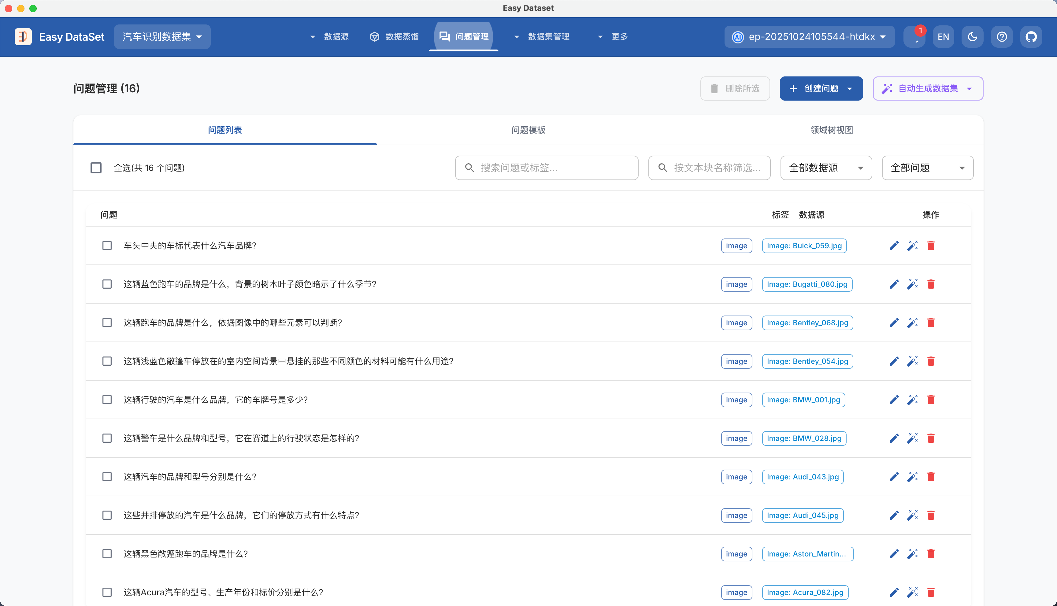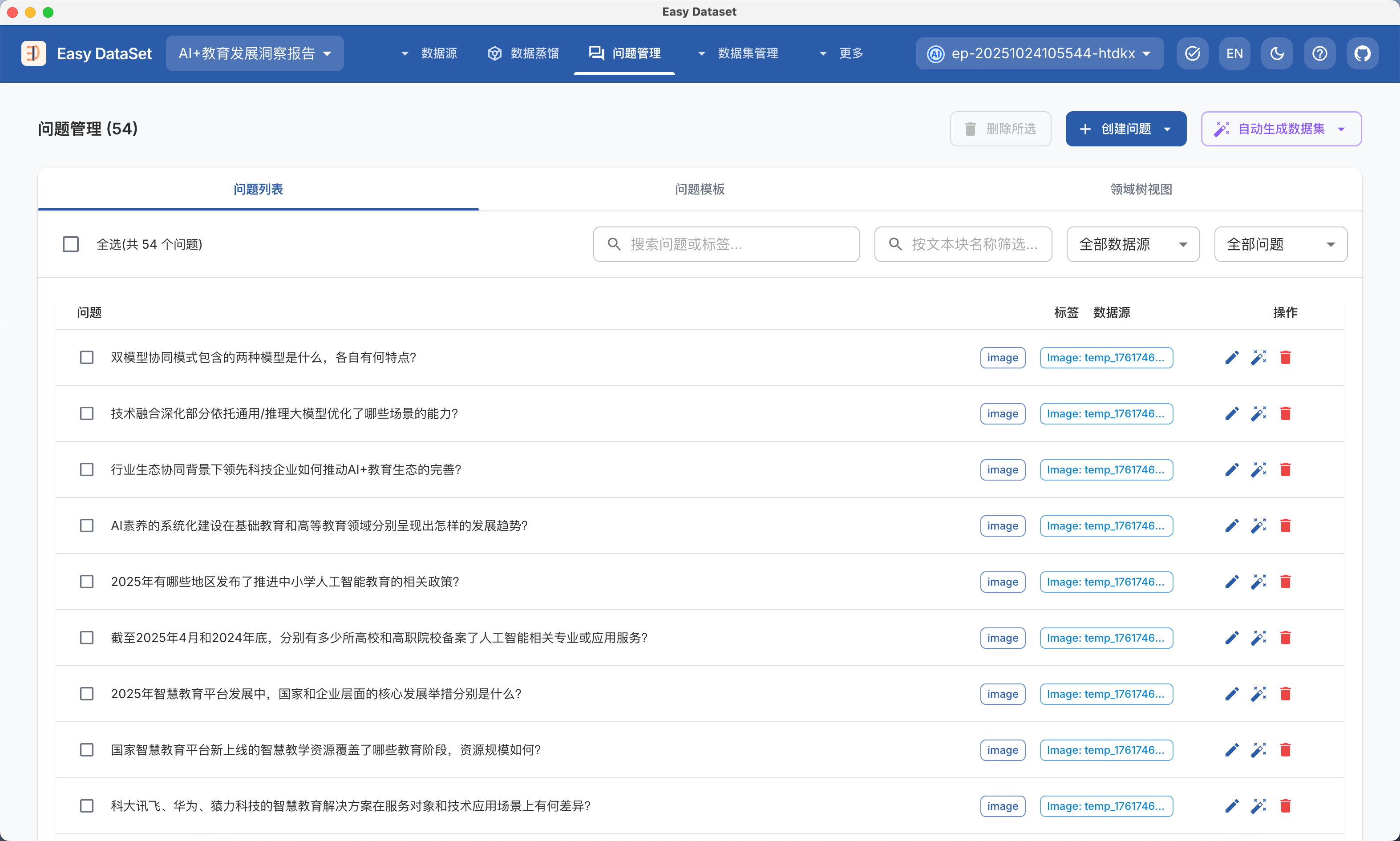 进入问题管理模块可以看到所有已经生成的问题,和普通问题的区别是数据源属性,普通问题关联的是文本块,而图片问题关联的是一张具体的图片: