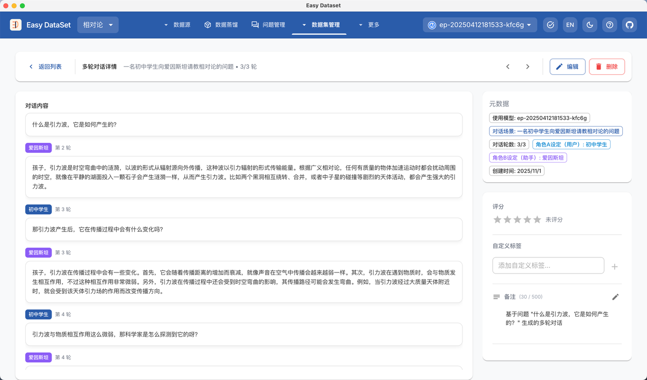 这样,我们不用等待整个蒸馏任务完成,就可以去 Review 已经生成好的数据集。下面,我们来到多轮对话数据集模块: