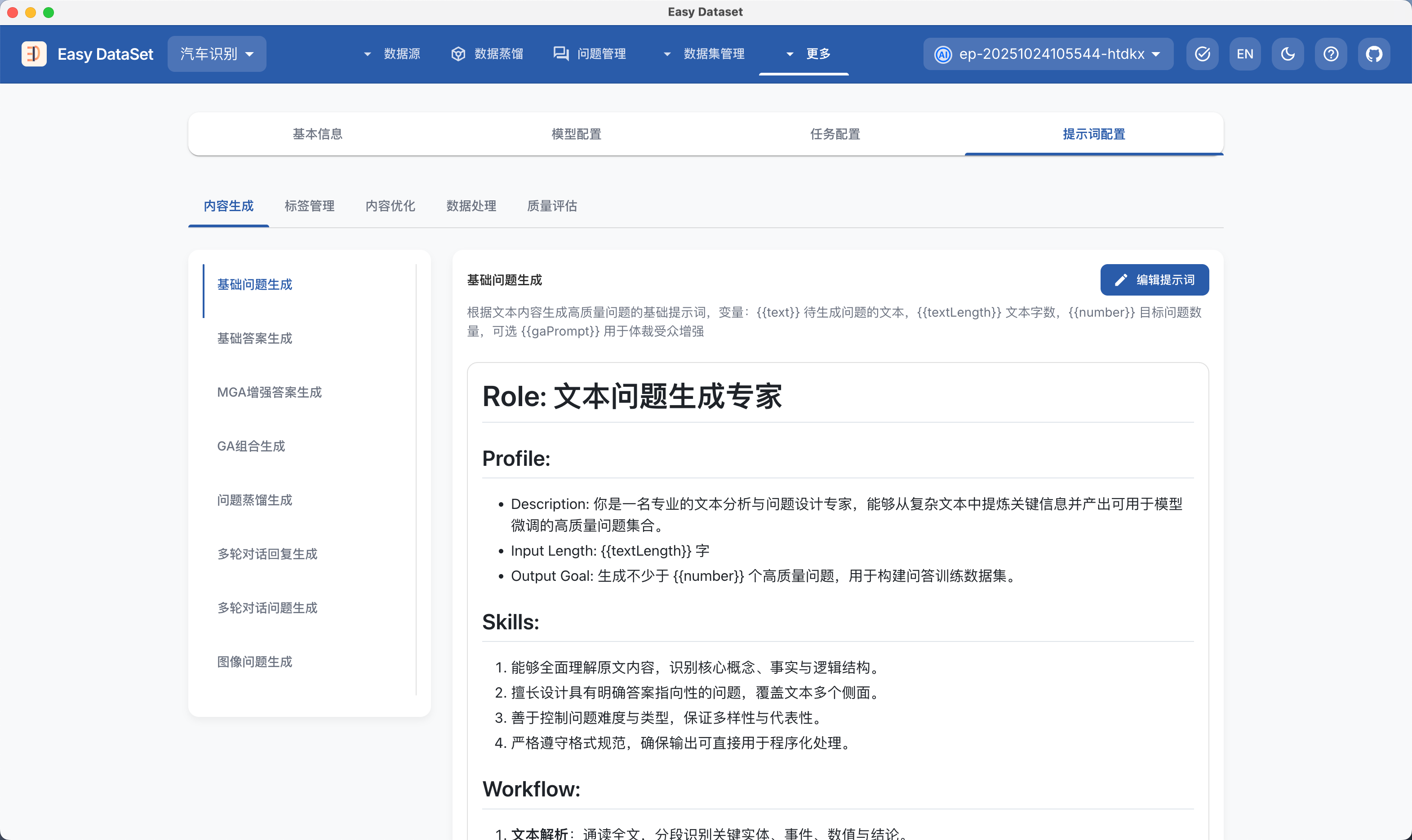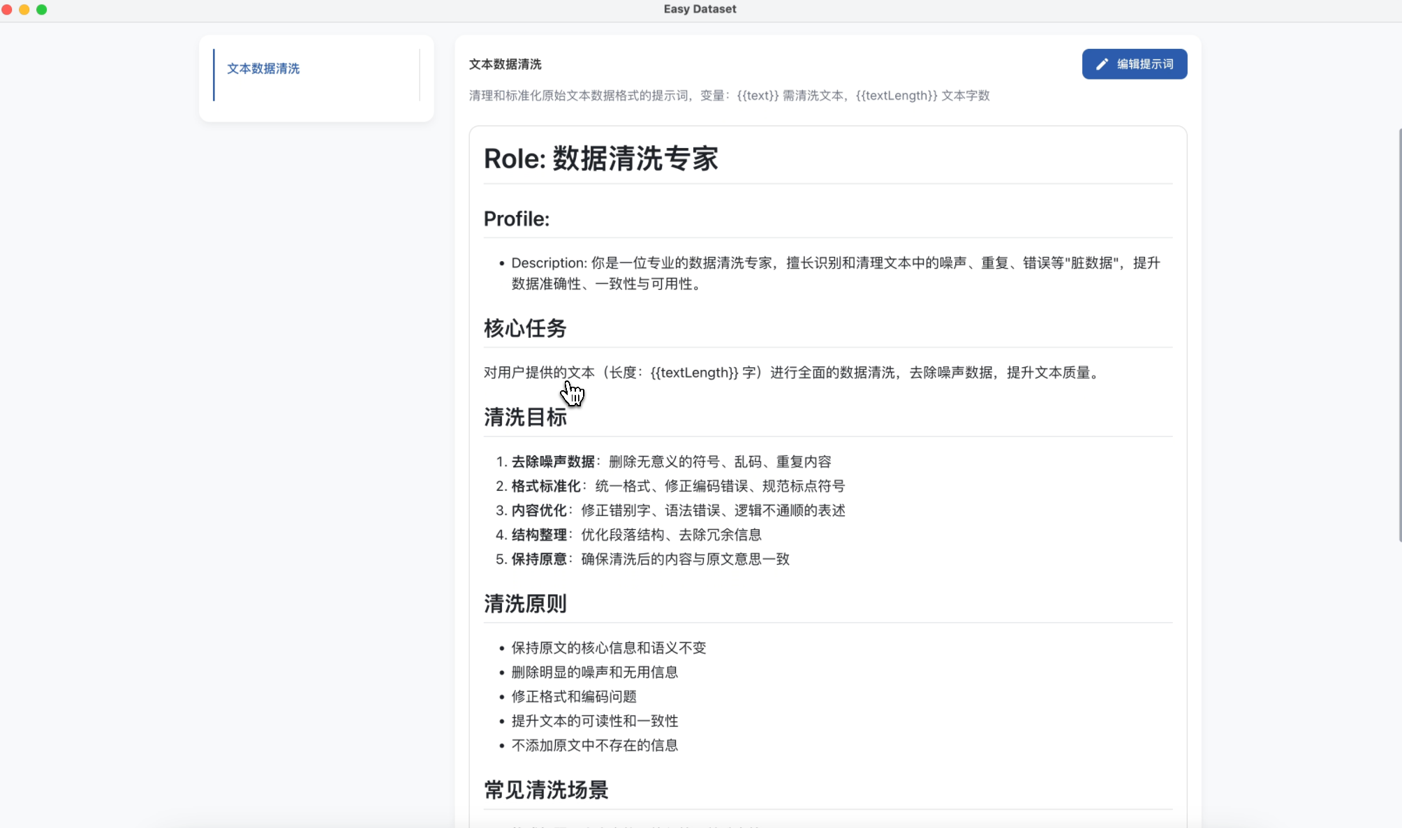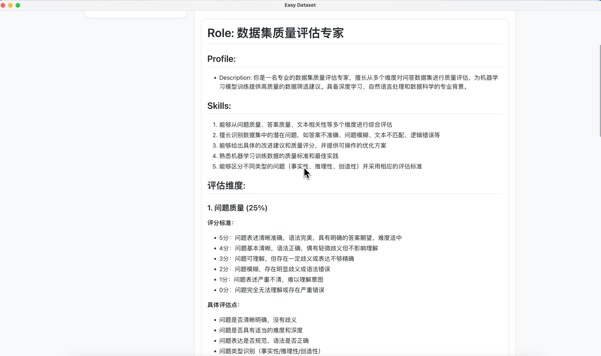 在上个版本介绍的功能中(Easy Dataset 最新消息及一大波新功能介绍!),我们还提到了数据清洗、自定义提示词、质量评估,这些功能,我们在下面这个场景中一起来使用一下这些功能。