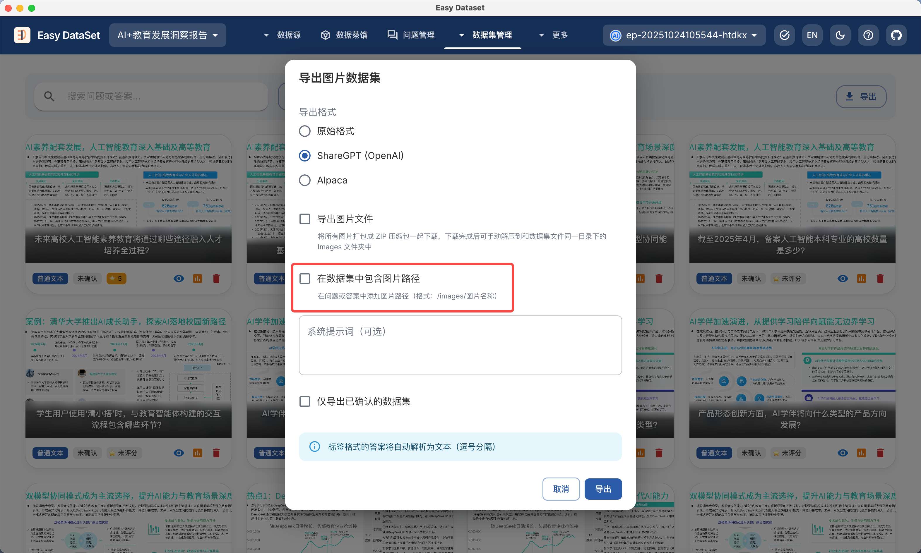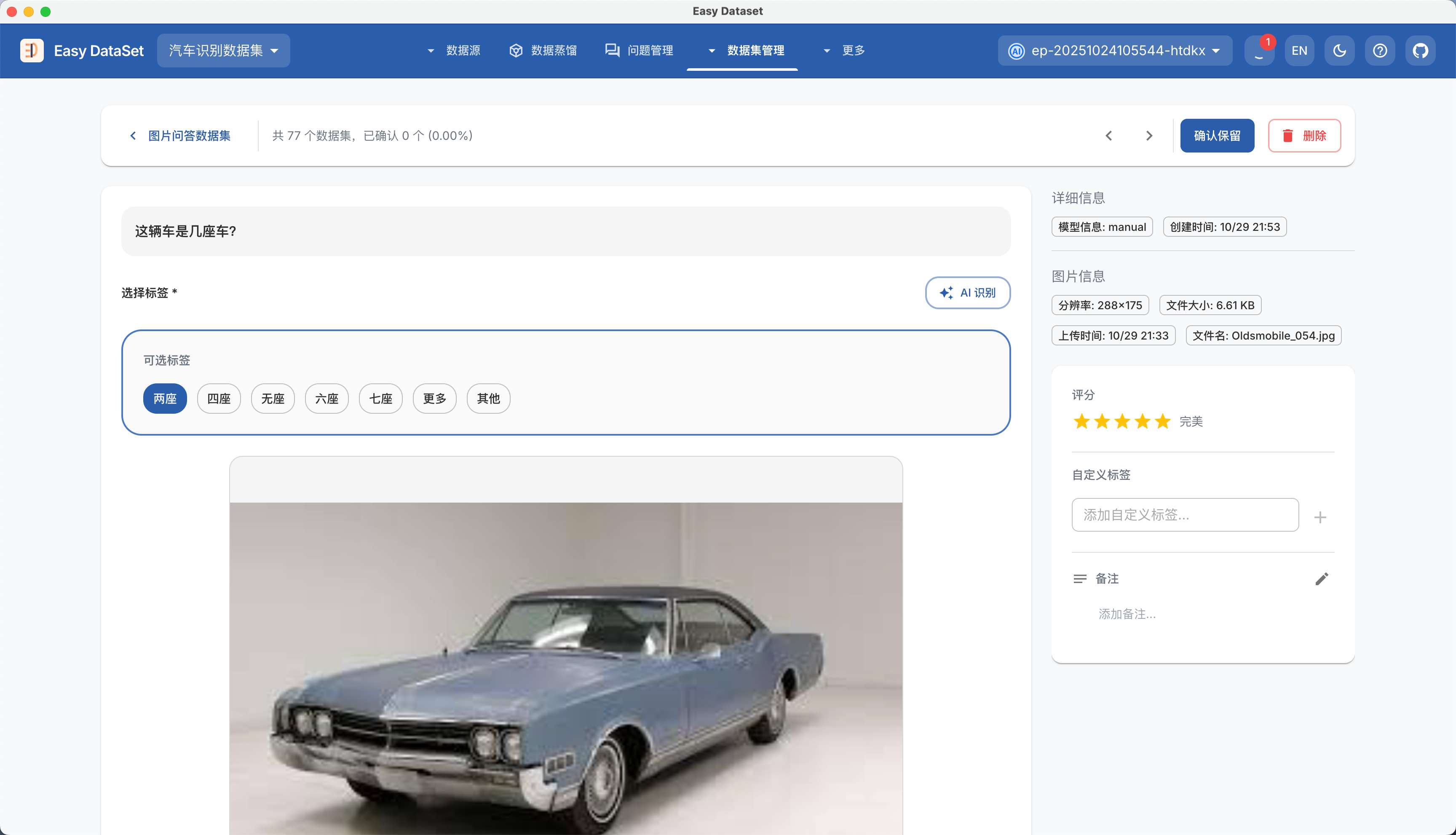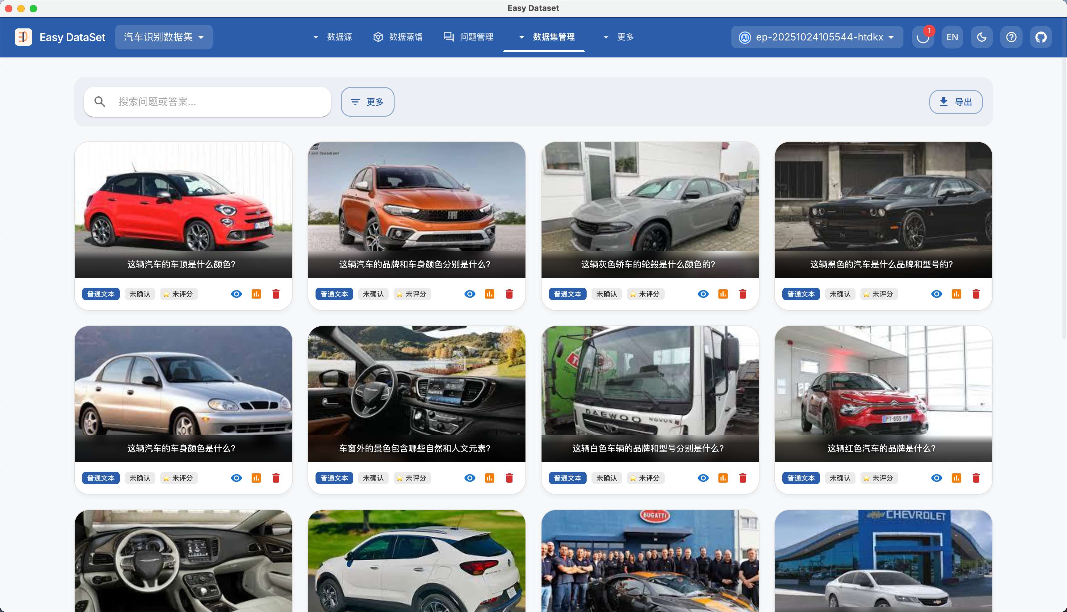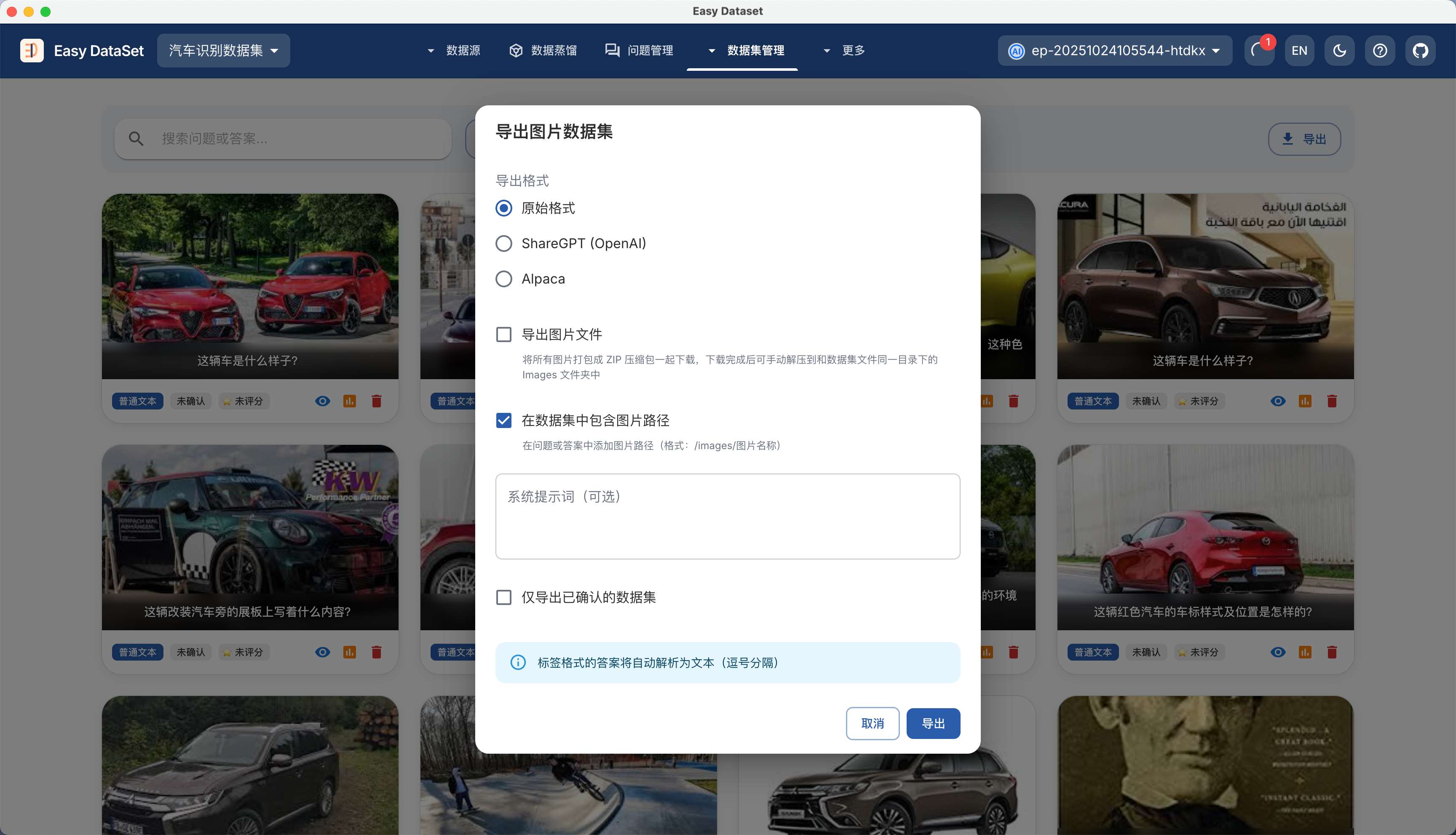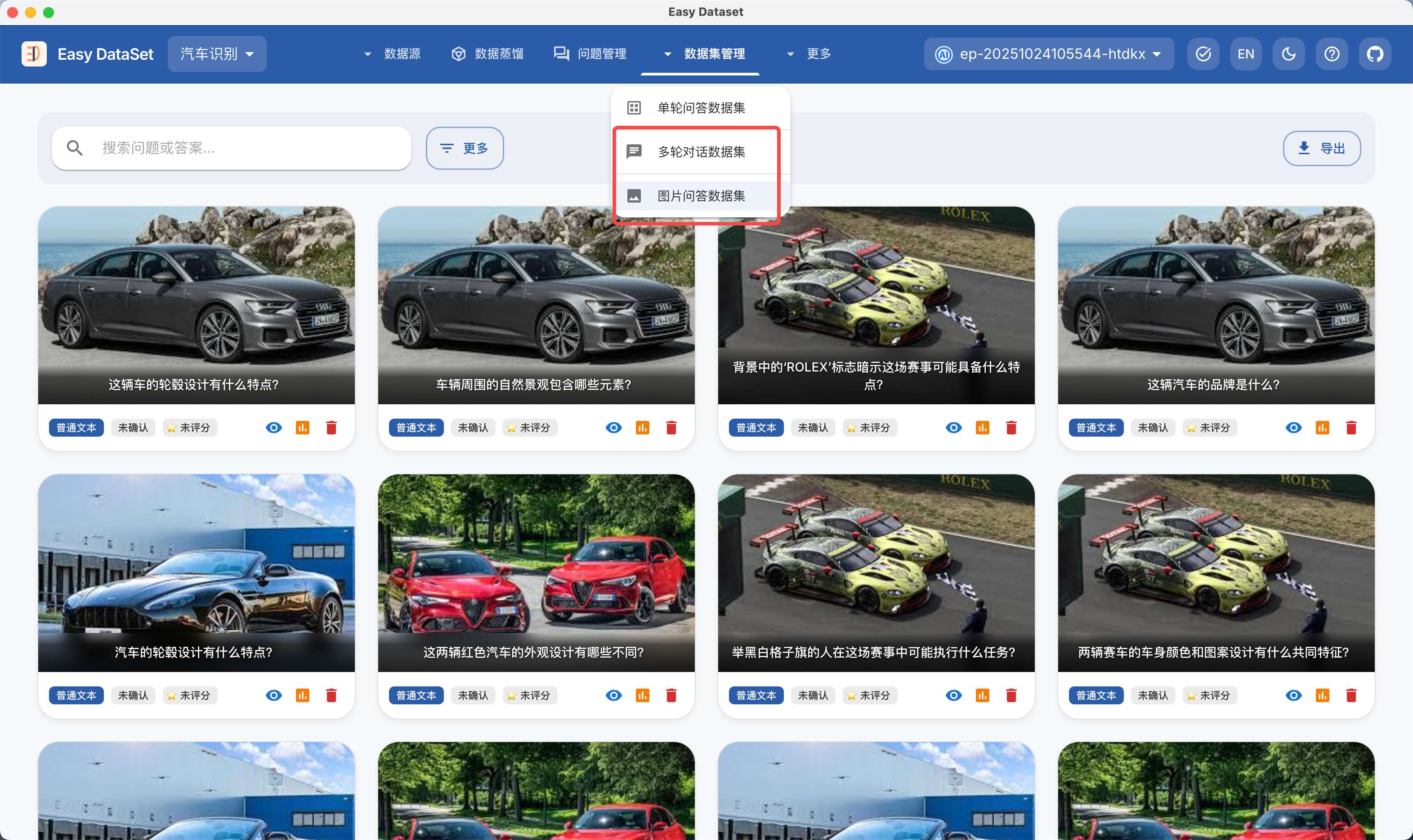 Easy Dataset(EDS)是一款AI智能应用,可将文献和图片中的知识转化为结构化数据集,用于模型训练和RAG场景。最新版本1.6.0新增图片处理、多轮对话数据集、问题模板等功能,支持数据清洗和智能评估。通过实际案例展示了汽车图片识别数据集和文本分类数据集的生成流程,包括图片导入、问题模板设置、智能标注和数据集导出等操作。