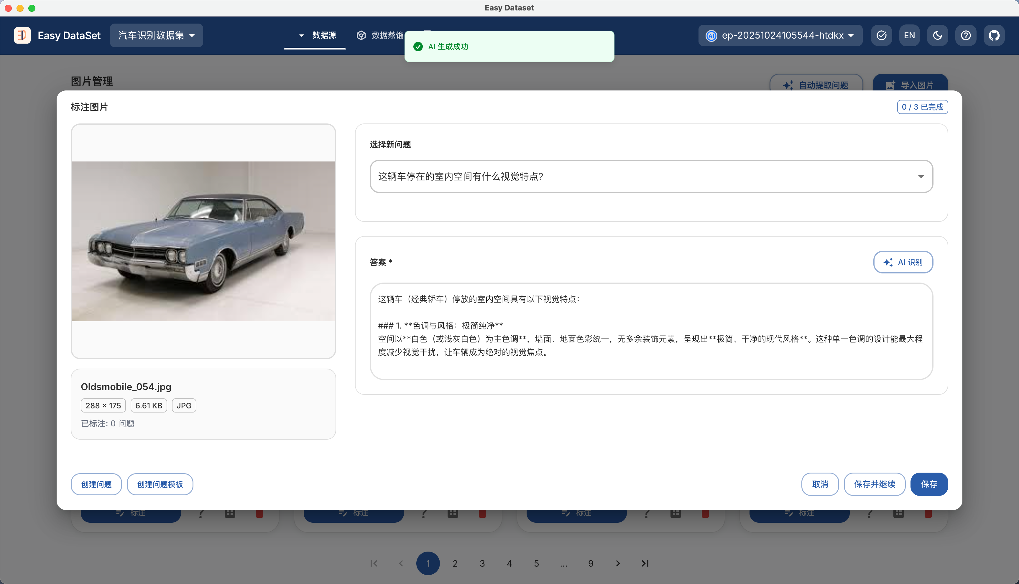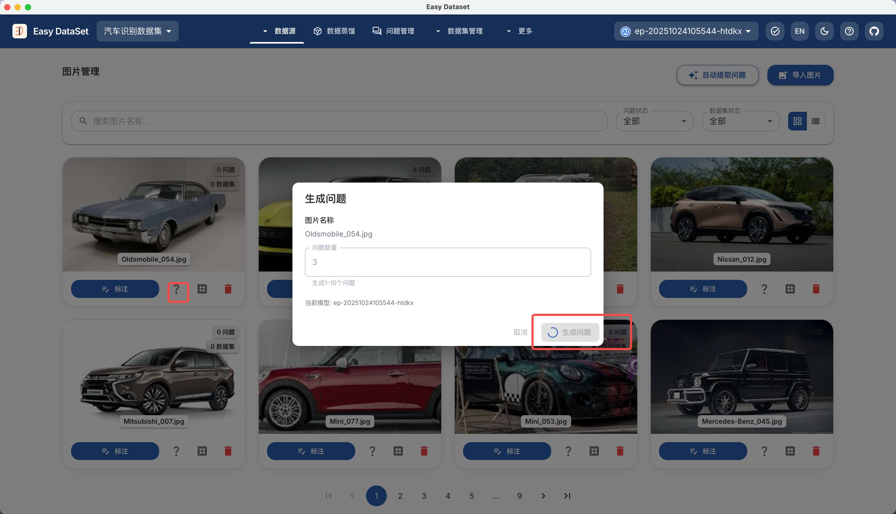 我们可以点击单个图片的生成问题,让 AI 智能根据图片识别问题: