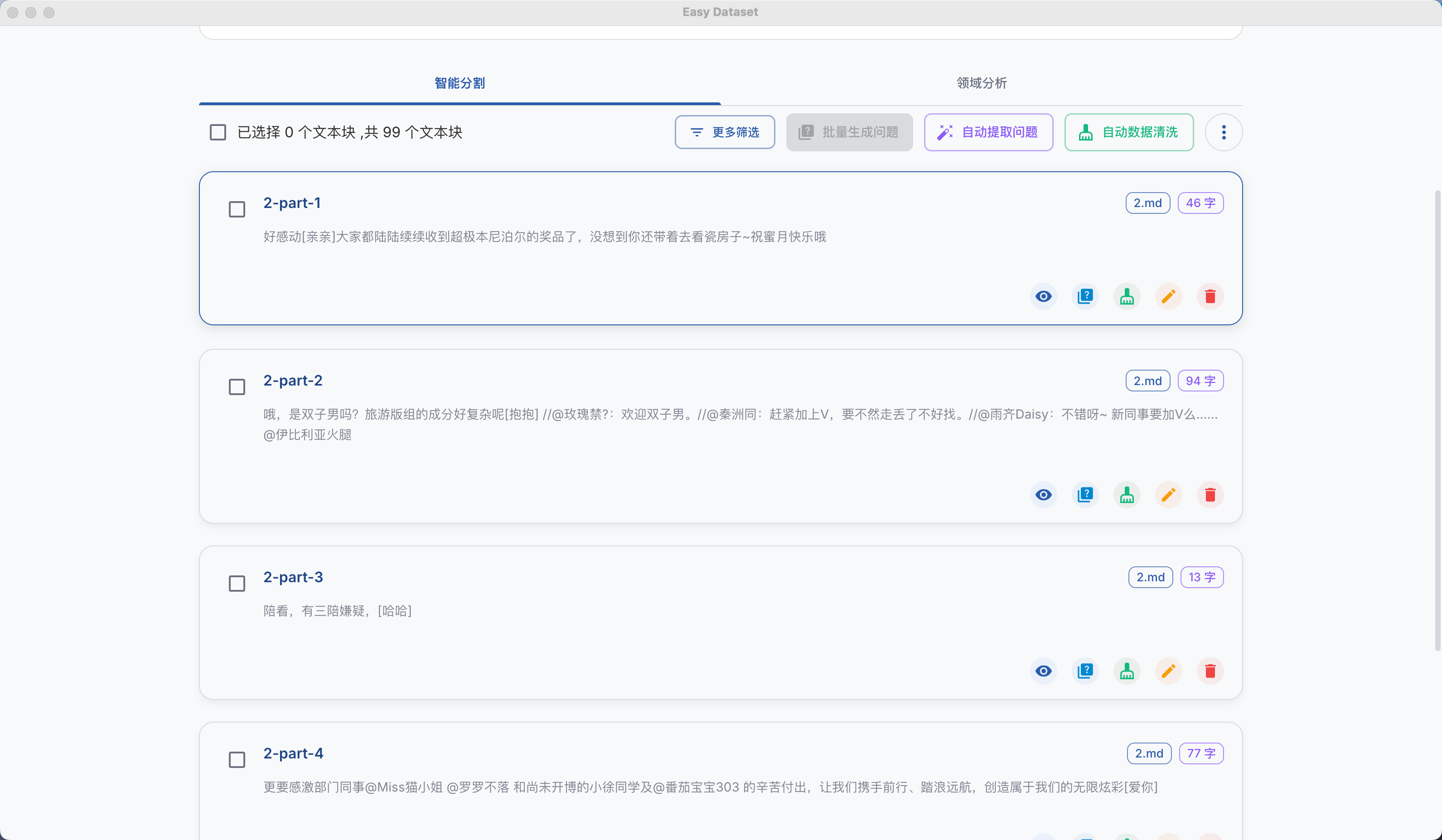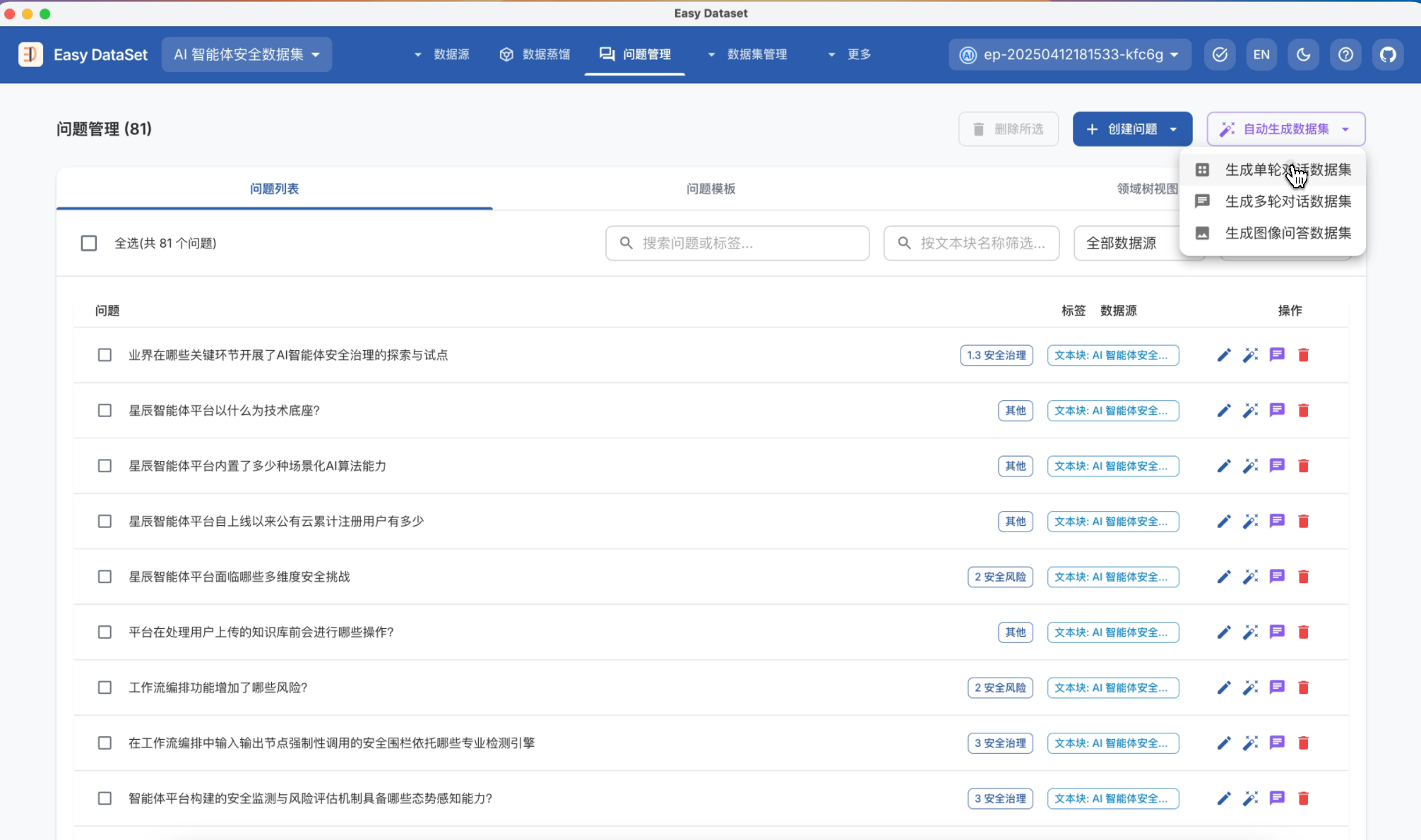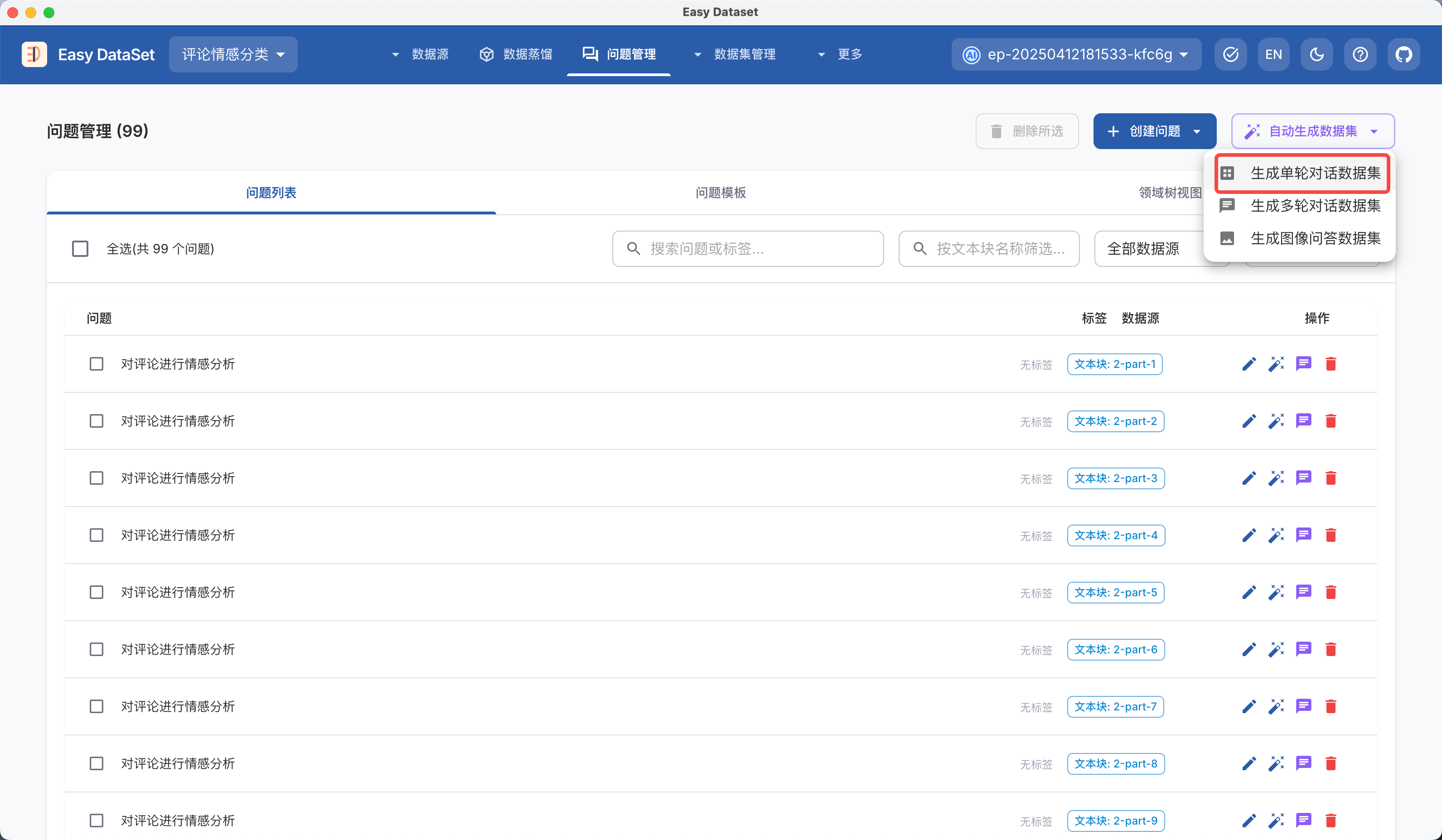 然后我们看到 EDS 为每个文本块都创建了这个问题,我们点击自动提取数据集 - 单轮对话数据集: