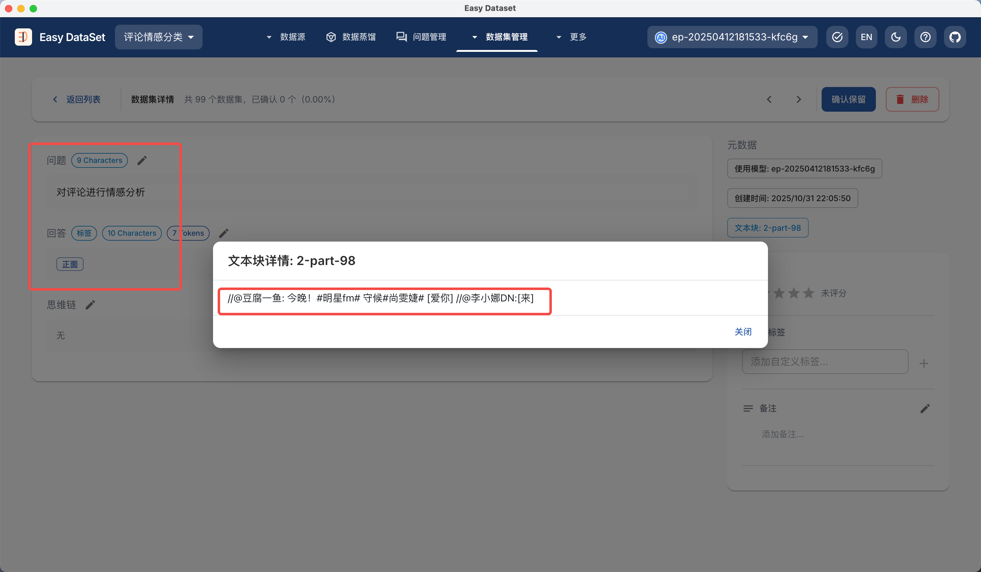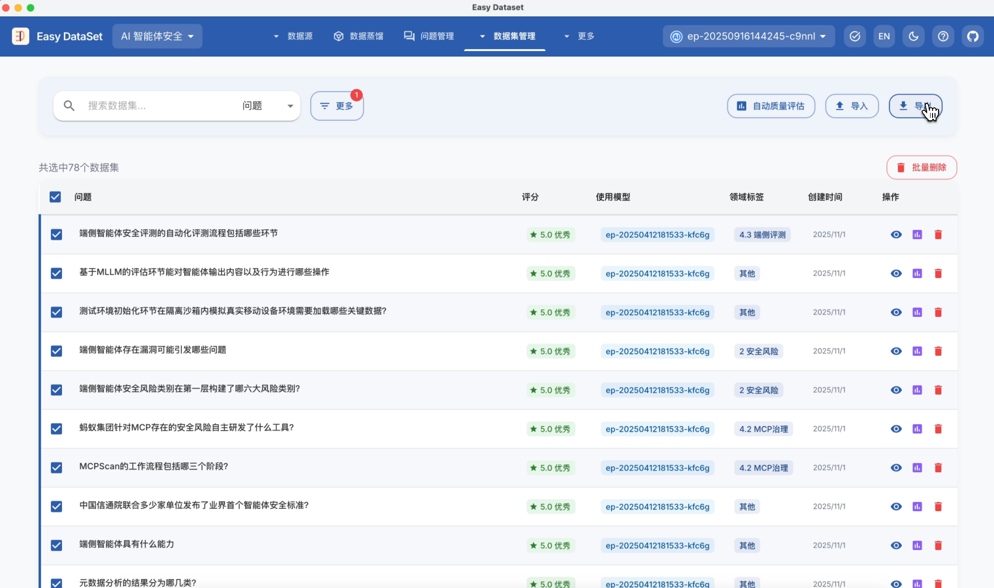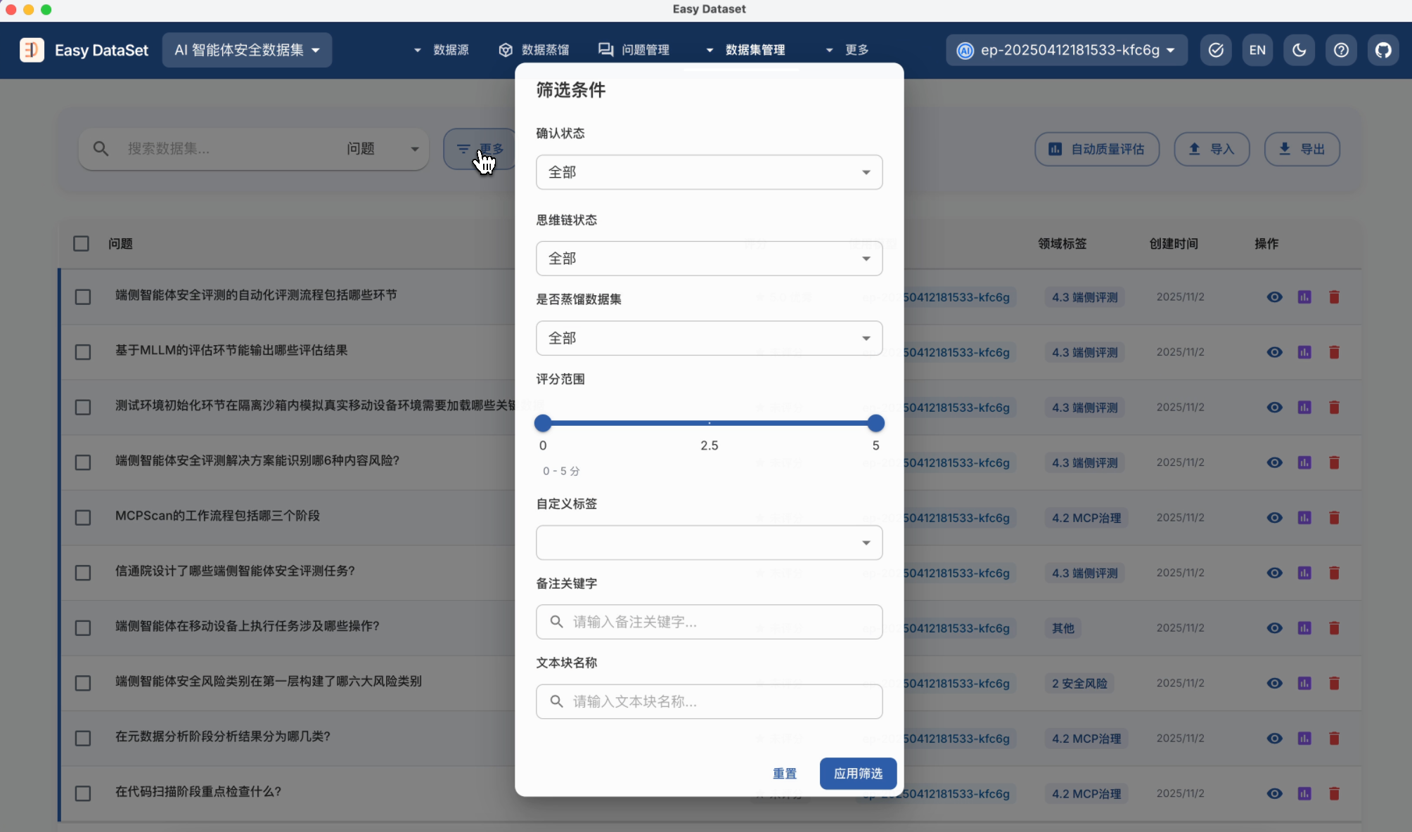 等待这些异步任务完成后,我们就可以到数据集管理模块对已经生成的数据集进行二次评估。为了满足灵活的标注需求,我们可以手动对这些数据集进行评分、添加自定义标签、以及备注。