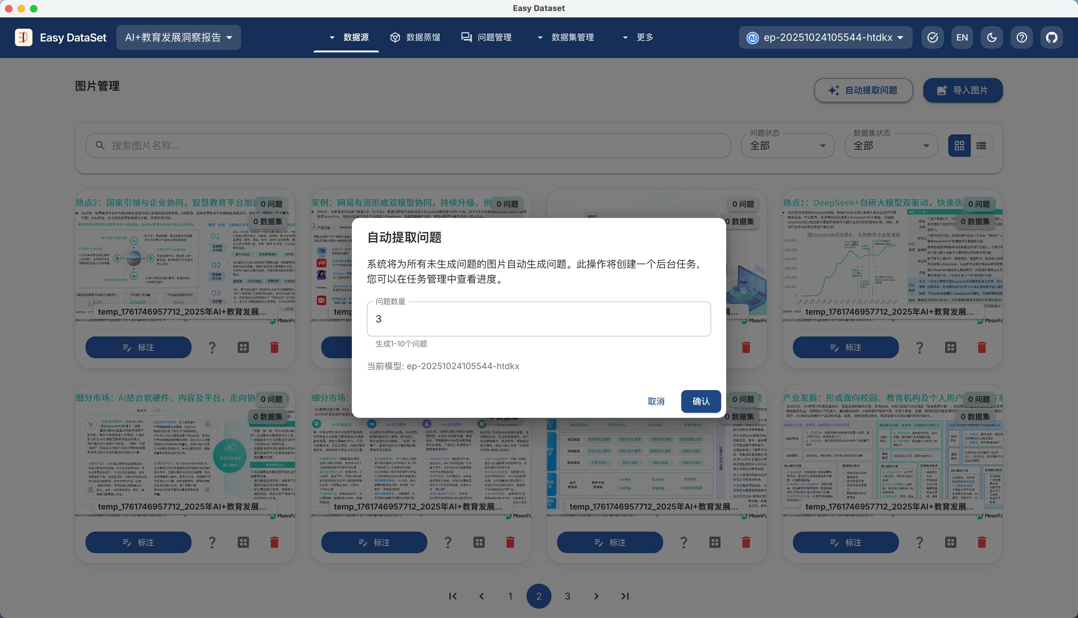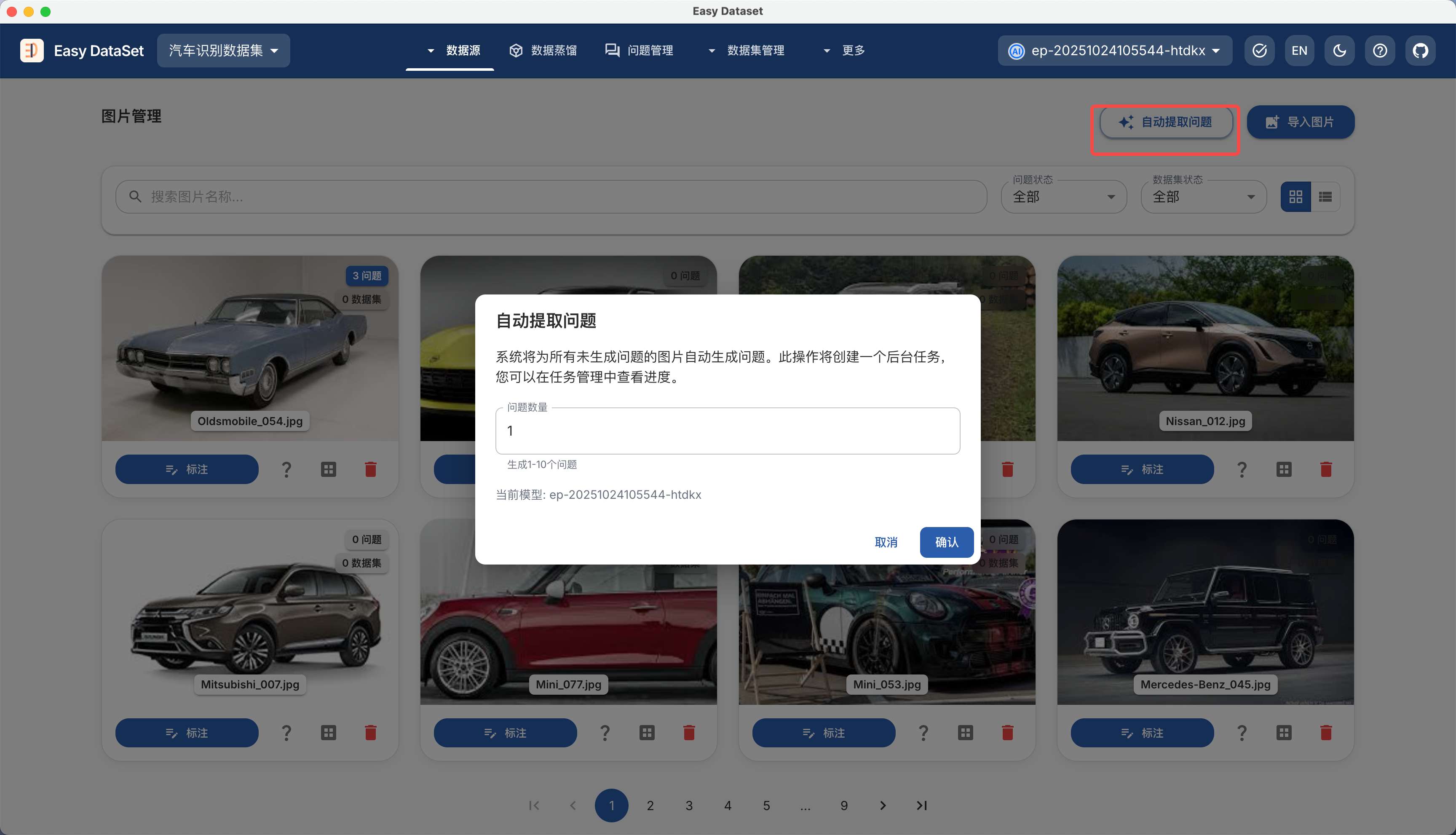 也可以点击右上角的自动提取问题,这将创建一个后台批量任务,自动为没有生成问题的图片来生成问题: